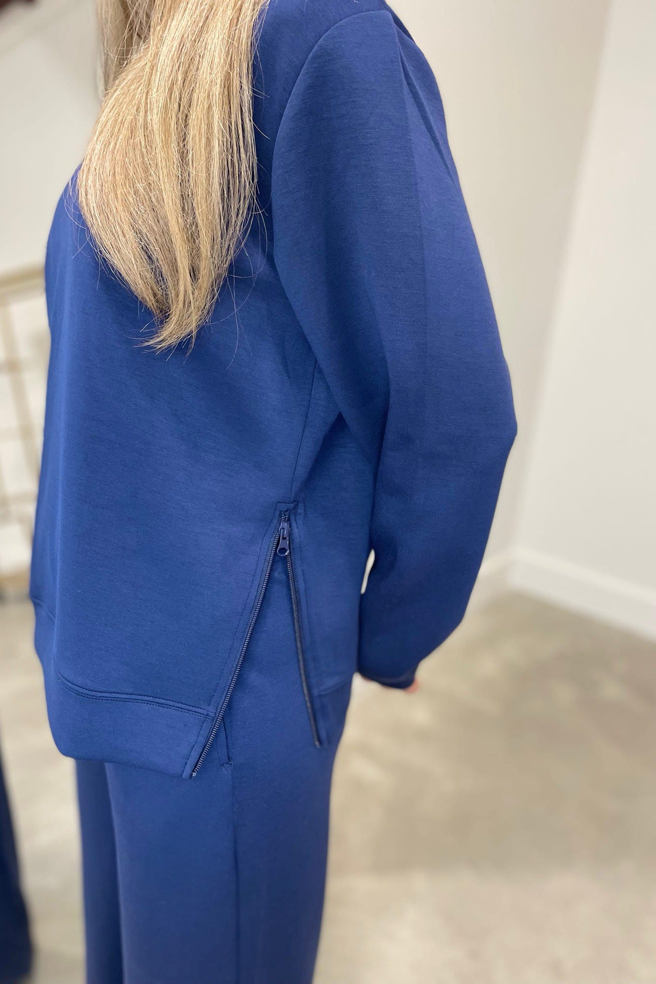 Ocean Drive Cloud Fleece Crew Neck Top w Side Zipper Detail Navy