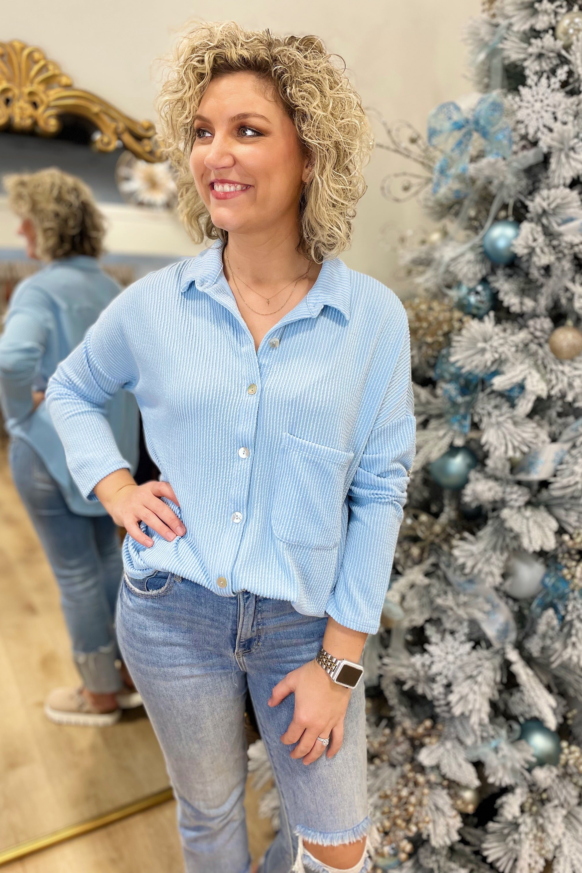 Out & About Button Front Collared Ribbed Top Baby Blue