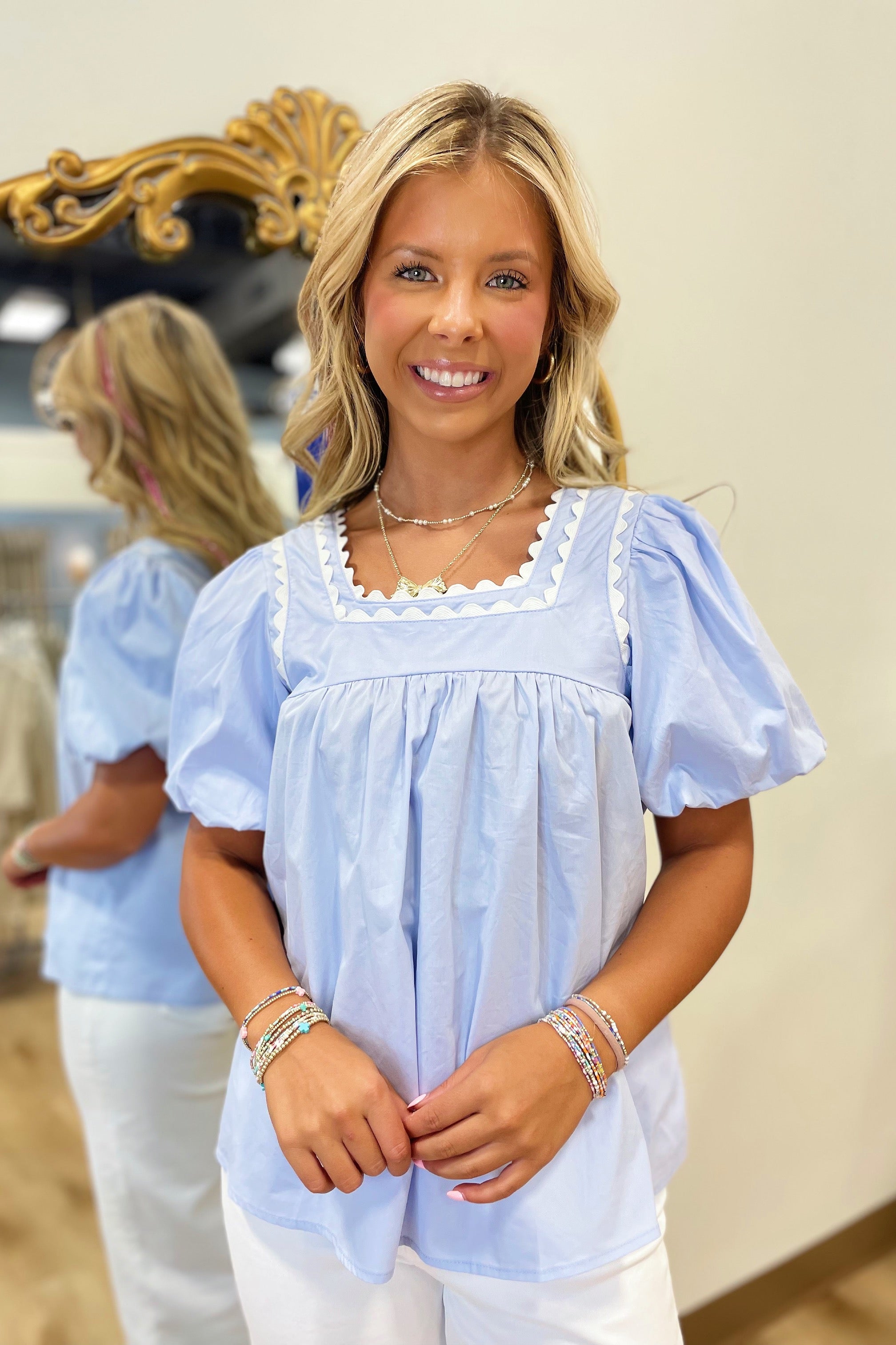 Picnic Anyone Puff Sleeve Square Neck Top Blue w White Ric Rac Trim