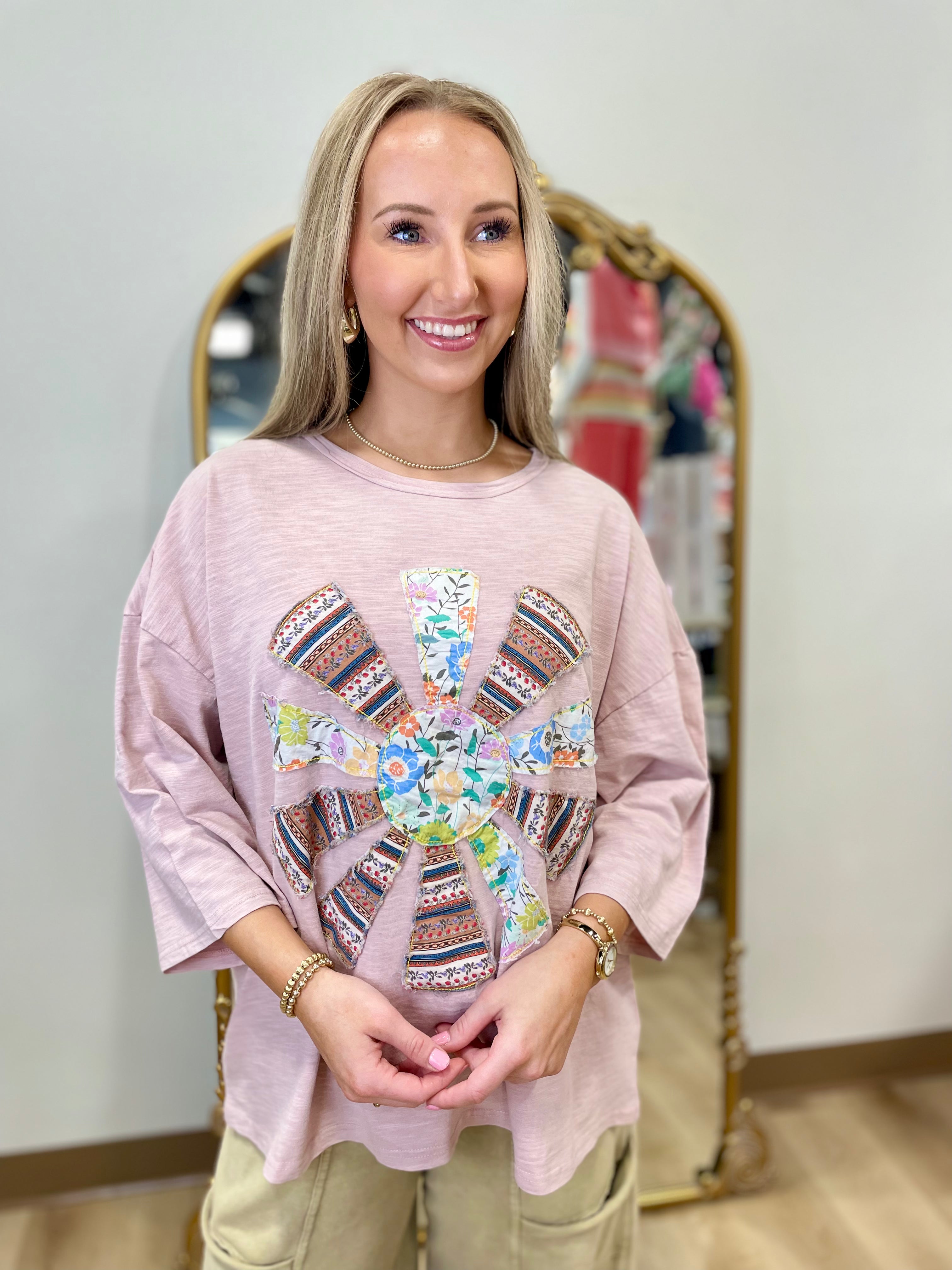 Pinwheel Applique' 3/4 Sleeve Tee Dusty Rose