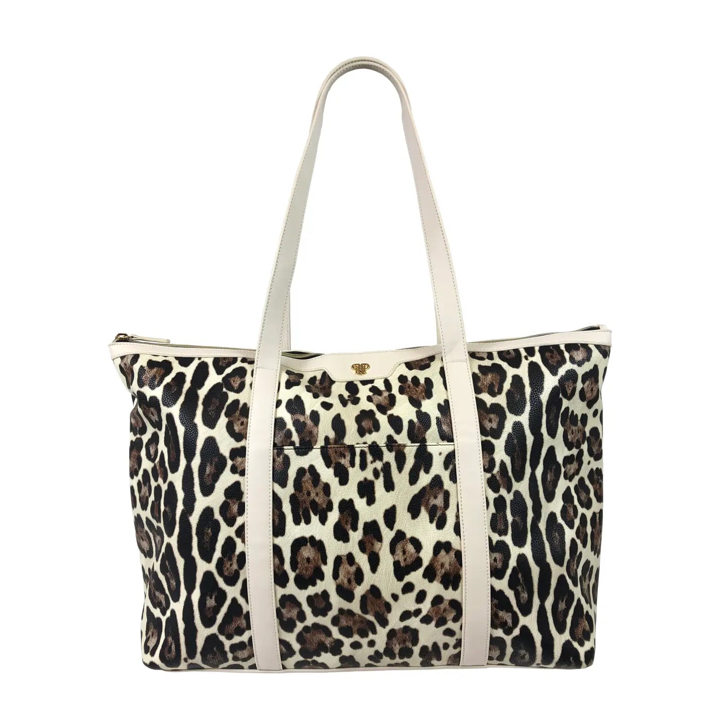 The Cream Leopard Getaway Tote is the perfect daily carry tote. Use it for day trips, as a chic diaper bag, weekend travel, or as that tote you take to the airport to carry your essentials. The back features a trolly sleeve to secure the bag over your luggage handles. Easily carry keys, wallet, umbrella, iPad, day book, and other must haves. Features: * 4 Large Interior Pockets * 1 Large Snap In Removable Pouch * Exterior Front Pocket * Top Zipper Closure * Easy to Clean Wipeable Interior Size Information: * 17.5" L x 5" W x14” H Material: * Cream Leopard and Cream - Vegan Leather Exterior * Cream - Coated Cotton Interior