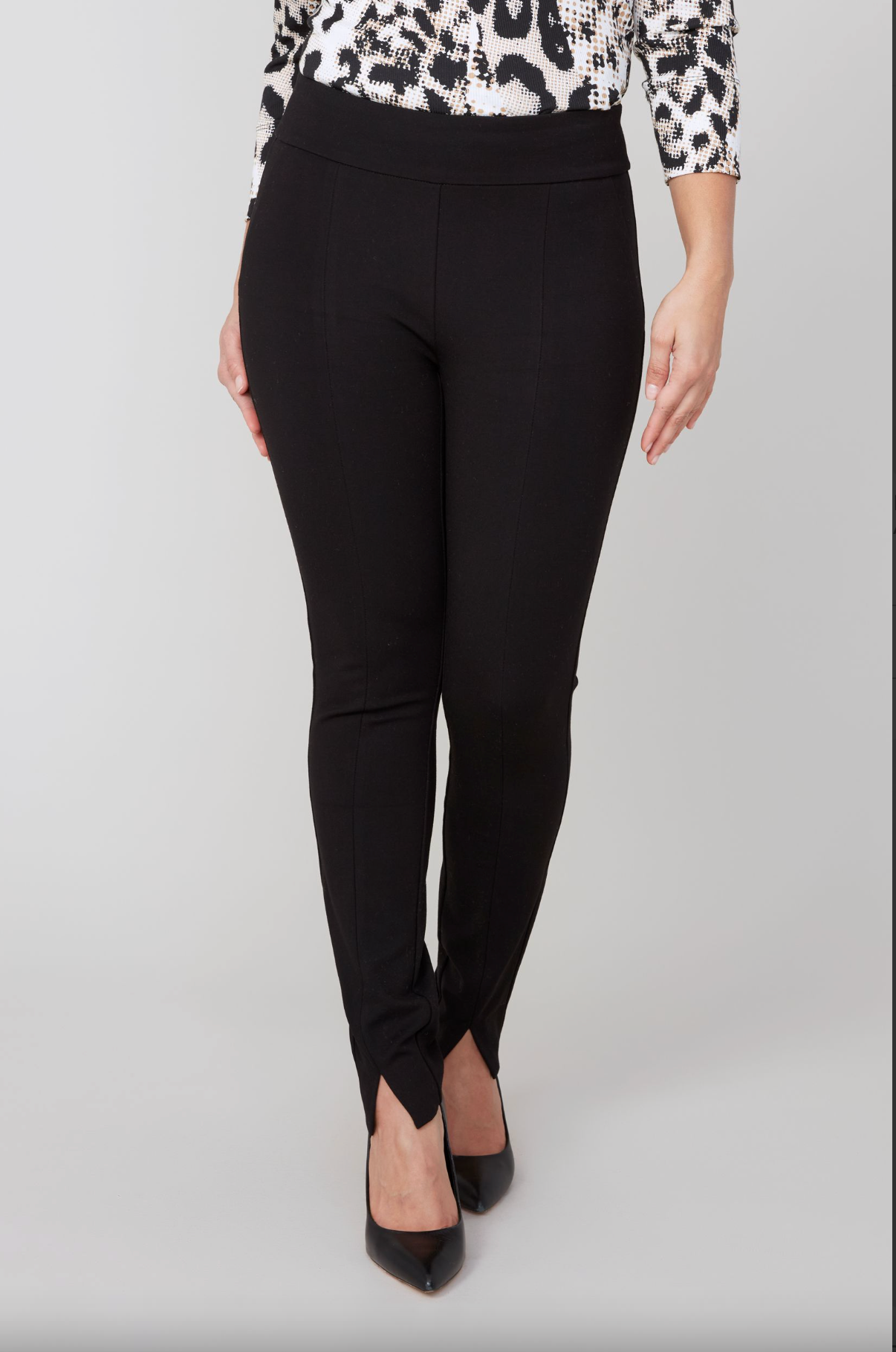 The Renuar Knit Pant in Black offers a comfortable pull-on design featuring an elastic waistband with a wide band for a secure yet flexible fit. Its faux pockets and front seam add subtle detail, while the front split hem creates a modern silhouette. Crafted for ease and style, this pant is perfect for everyday wear with a polished finish.