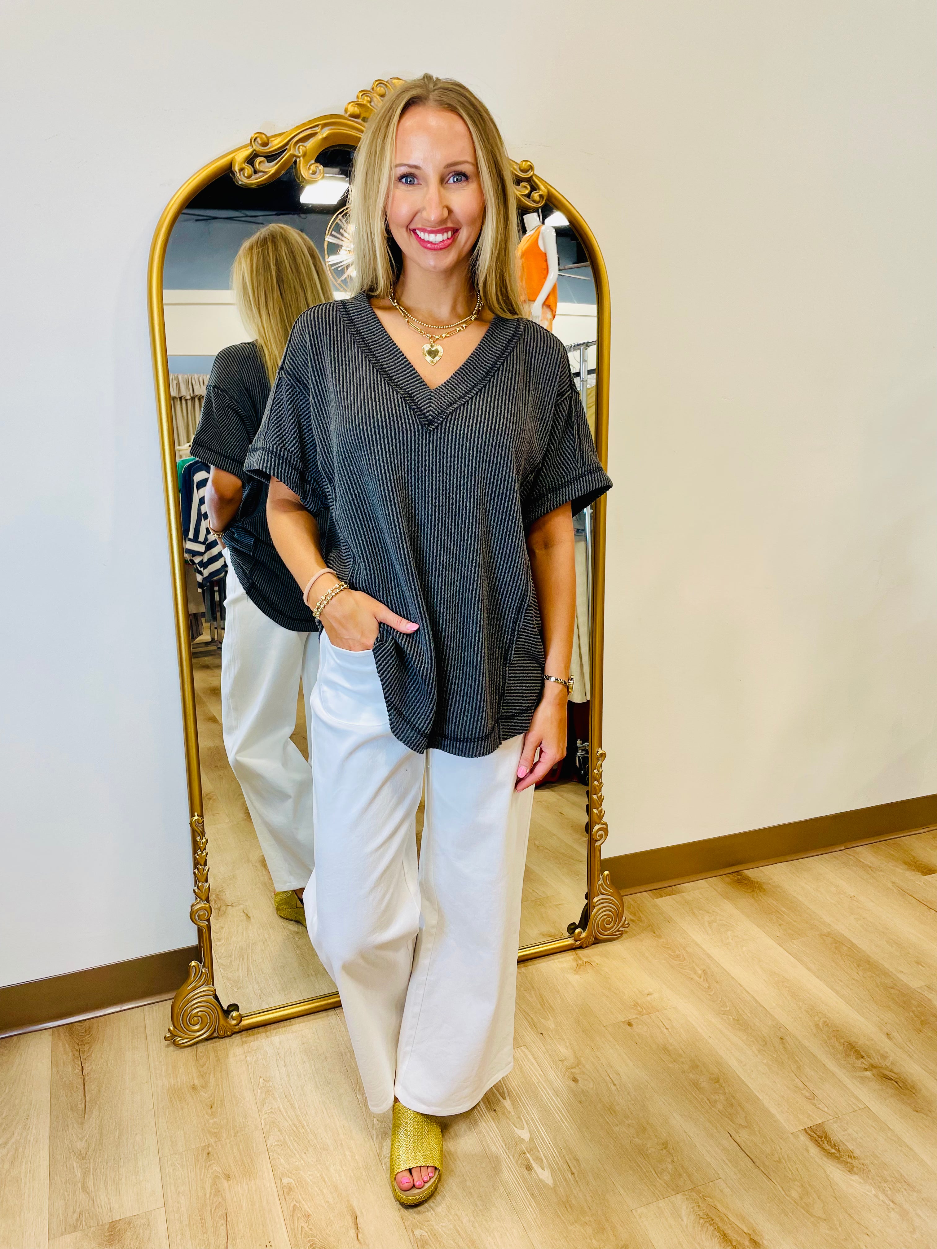 Ribbed V Neck Short Sleeve Top Charcoal