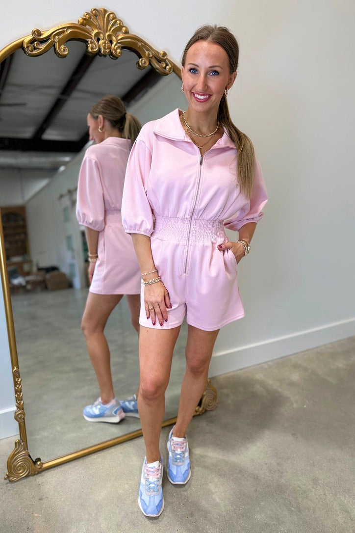 Full Front Zip Closure Romper w Smocked Waist.