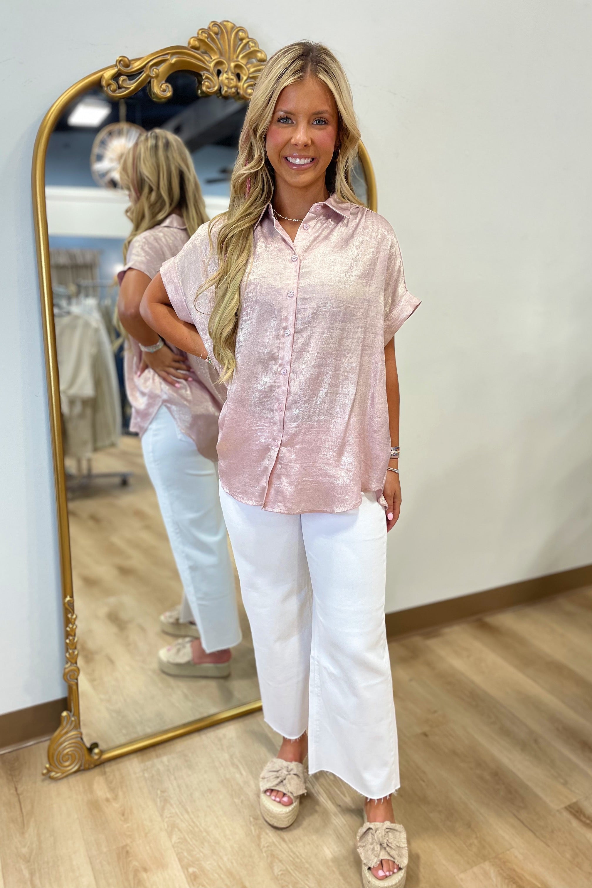 Shimmer in Pink Button Front Collared Short Sleeve Top