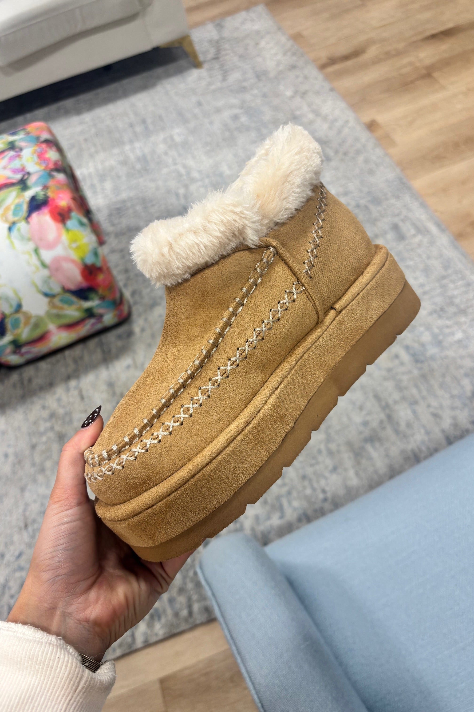 Soft, neutral, and endlessly wearable-ULLA in Bone Suede brings a fresh twist to cozy winter styling. With its tonal whipstitch details, plush faux shearling trim, and elevated sole, this bootie feels both grounded and elevated. Pair it with knits, denim, or loungewear for a snug-yet-stylish cold weather look.