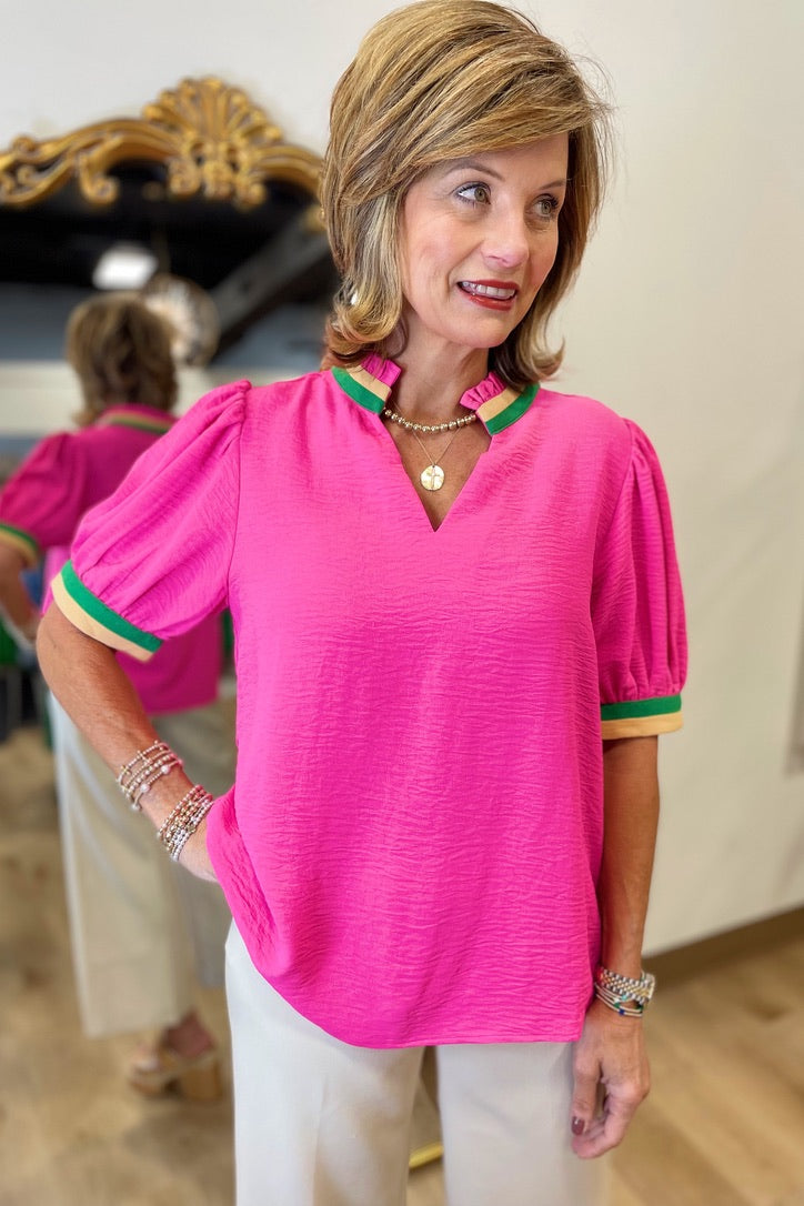 Smart Start Style Short Sleeve Blouse w Accent Trim Hot Pink