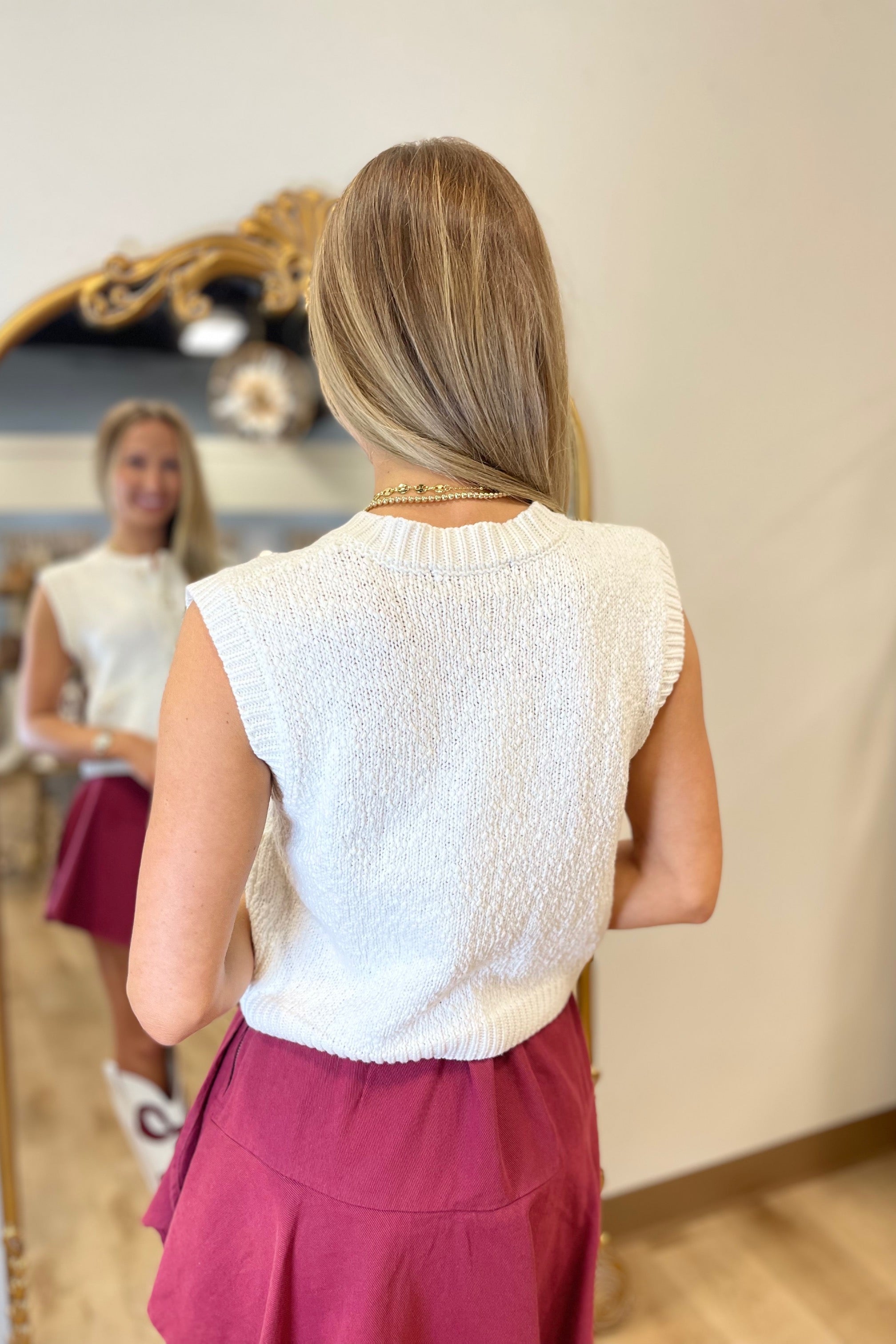 Soft Form Knitted Pearl Jeweled Button Front Vest White