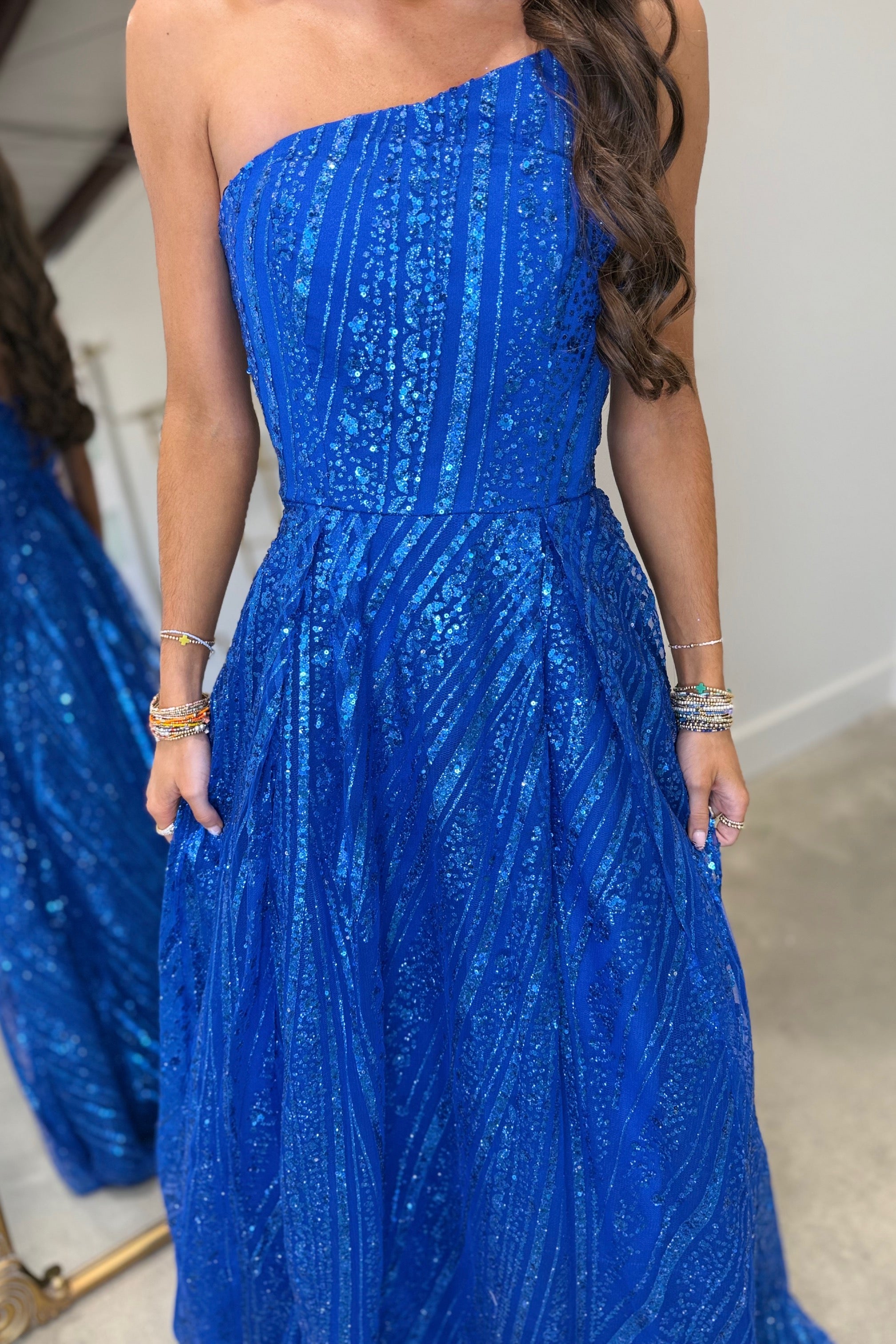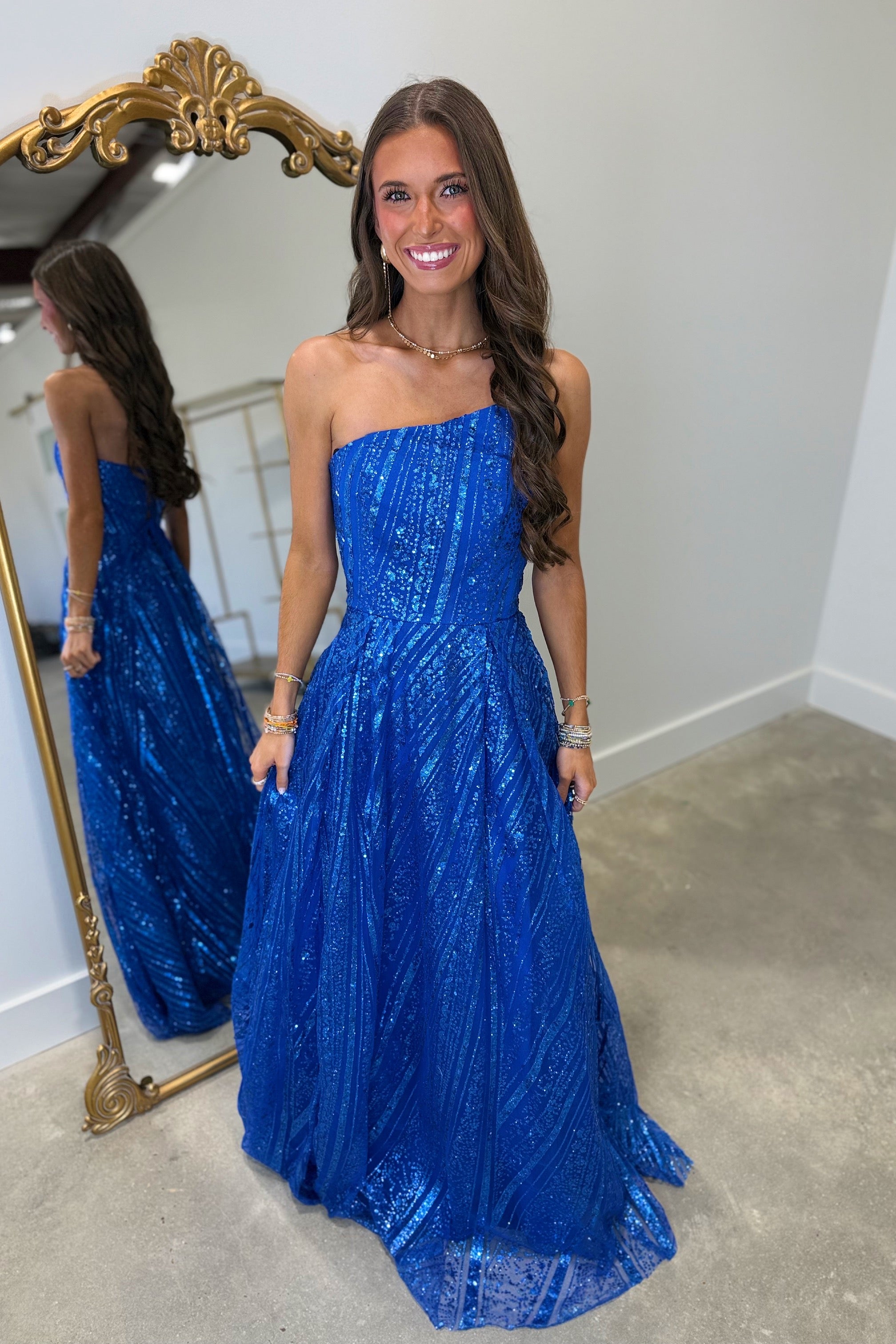 This long dress is completely covered in shimmering sequins, capturing the light for a dazzling effect with every movement. The sophisticated bustier creates an elegant and feminine silhouette. The sequins cover the entire fabric, providing a continuous sheen from the top to the base of the dress, creating a luxurious and dramatic look. The back of the dress is beautifully laced. This detail adds a romantic touch and allows you to personalize the outfit for a perfect fit. The laces create a corset effect that reinforces support while providing a delicate and sensual touch.