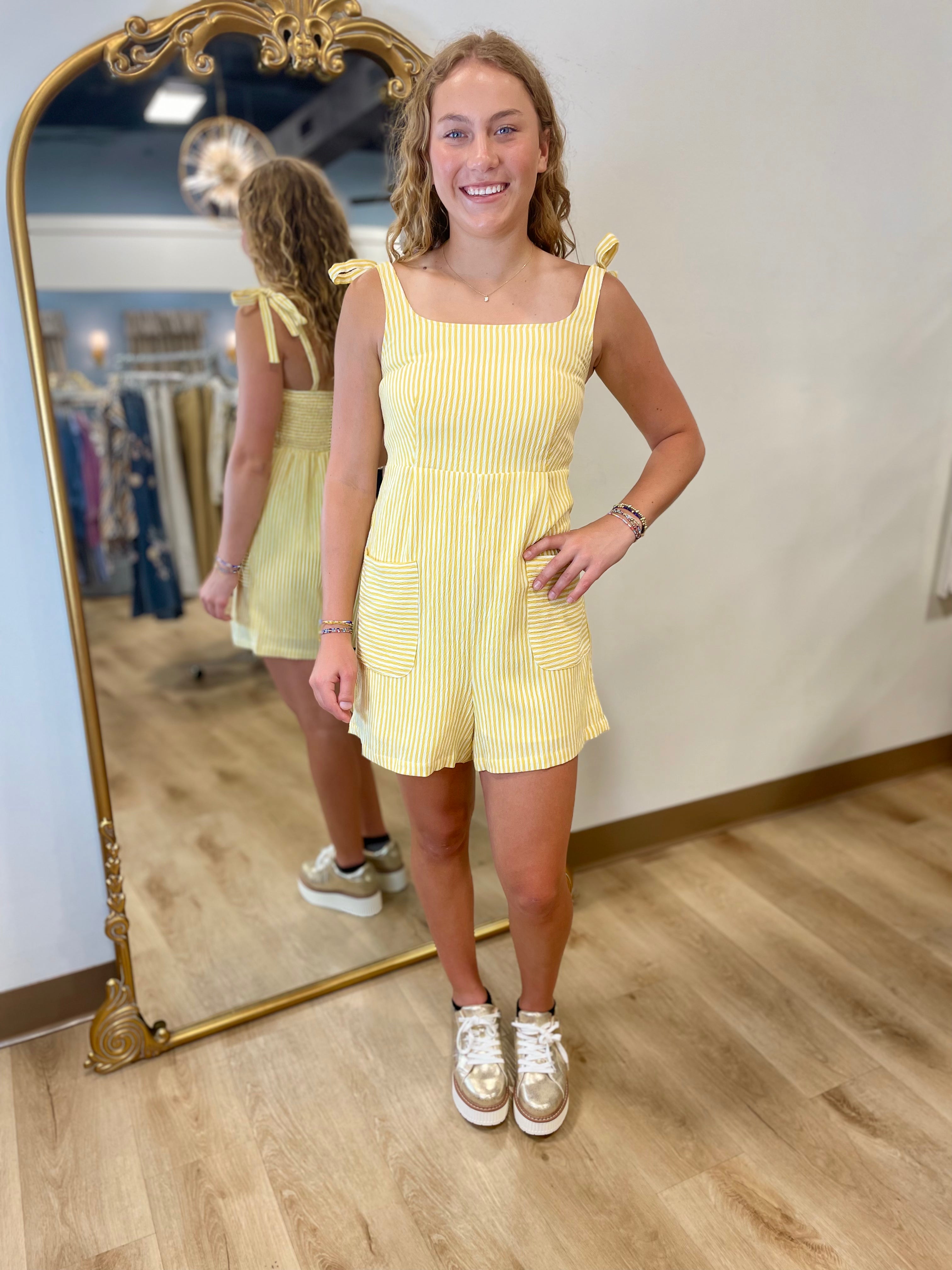 Striped Delight Shoulder Tied Smocked Back Romper w Front Pockets Yellow/White Lined.