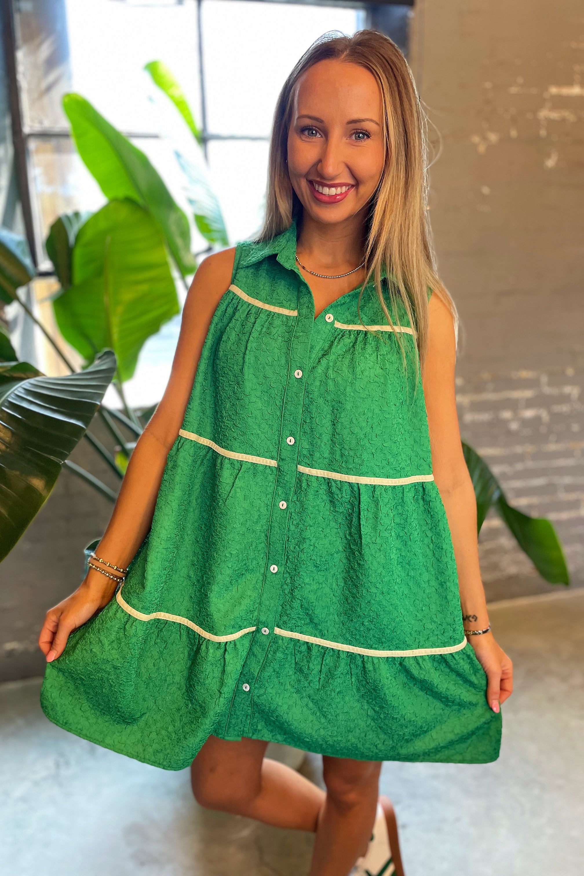 Summer Swing Button Front Textured Mini Dress Green