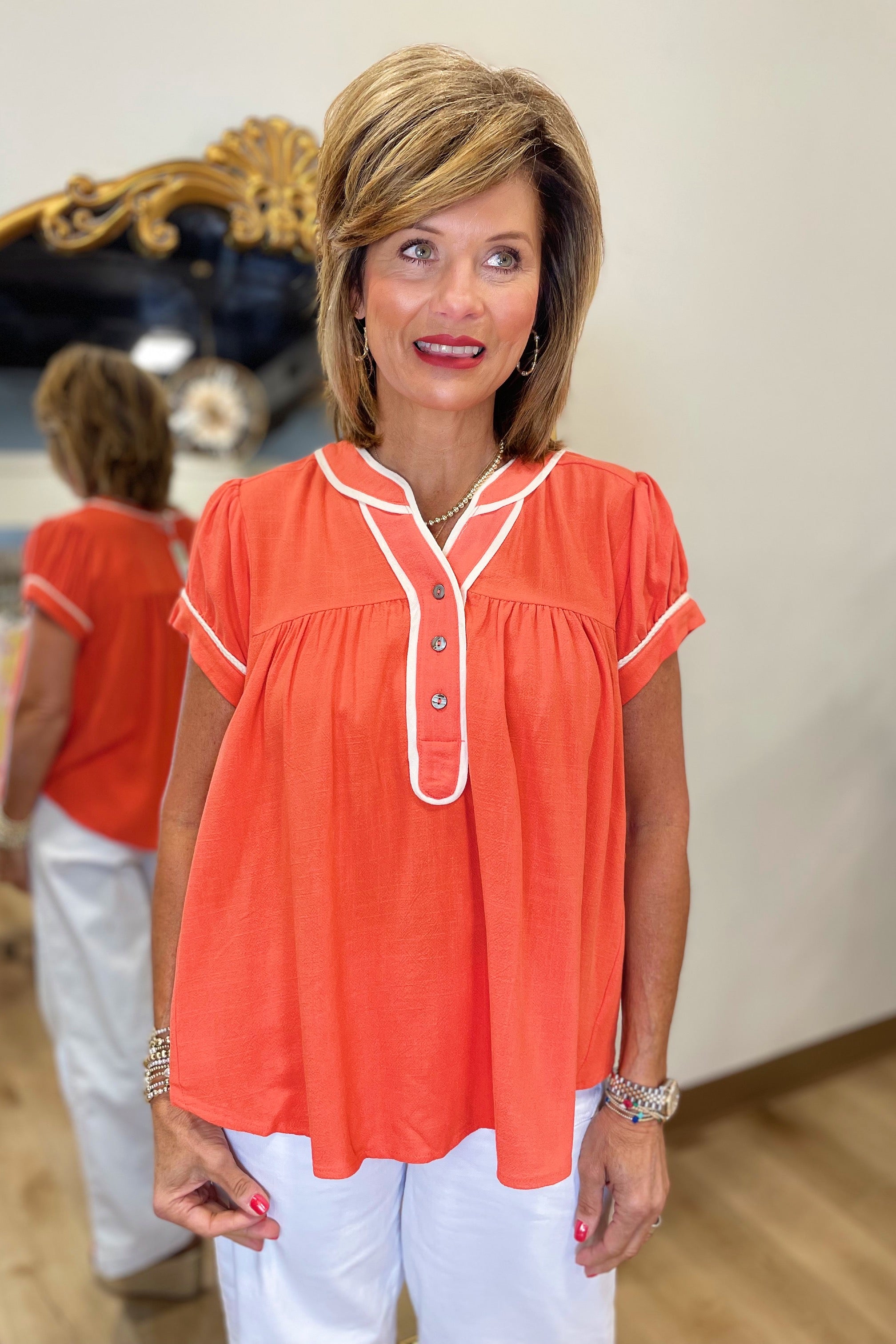 Sunset Surprise Split Neck Short Sleeve Top w Cream Braided Trim