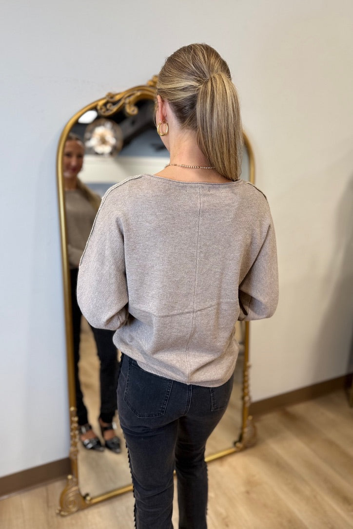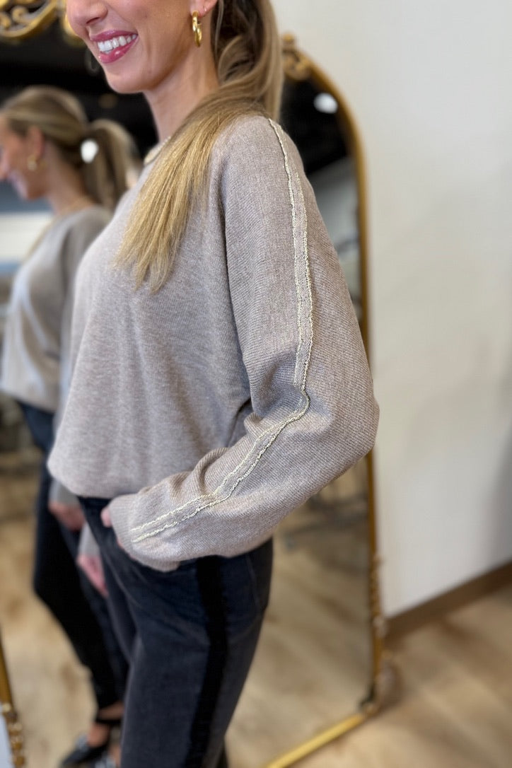 This heather taupe sweater, featuring a boat neck and metallic details on the sleeves, elevates your casual look. Dolman sleeves add a relaxed yet sophisticated touch, making it a must-have for any fall wardrobe. Perfect for brunch or a laid-back outing, this sweater keeps you stylish and comfortable.