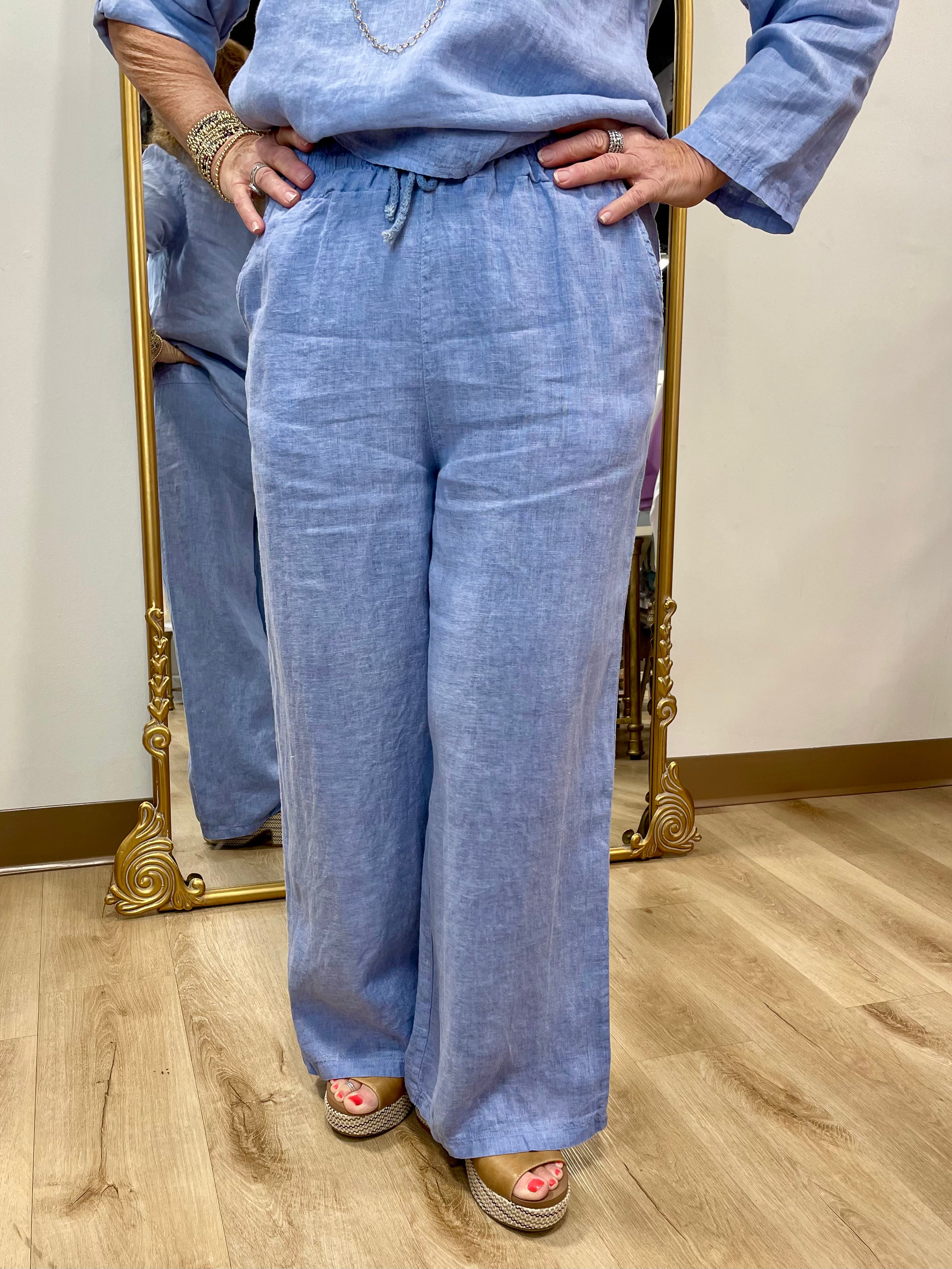 Tempo Paris Linen Elastic Waist Pants w Front Pockets Denim
