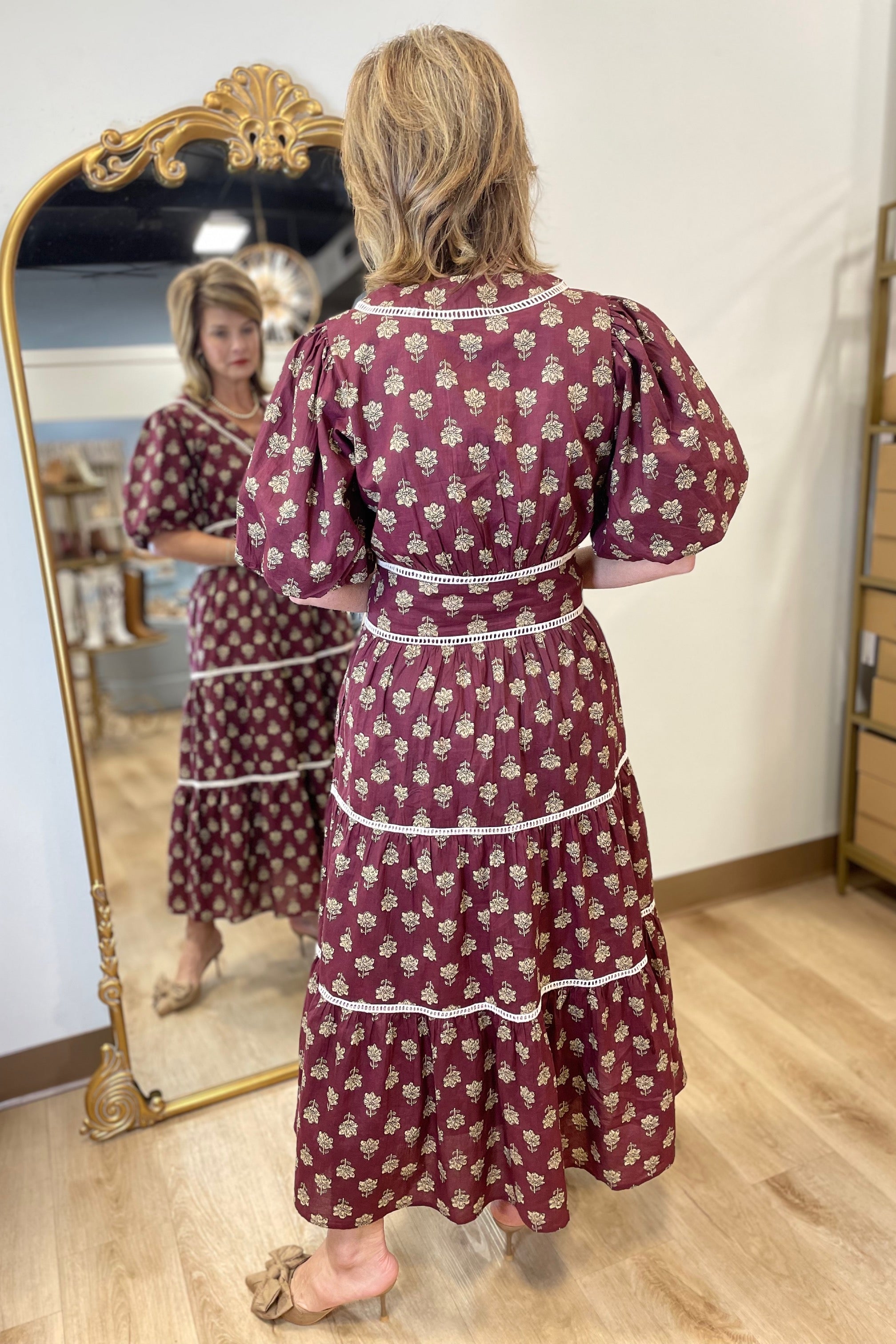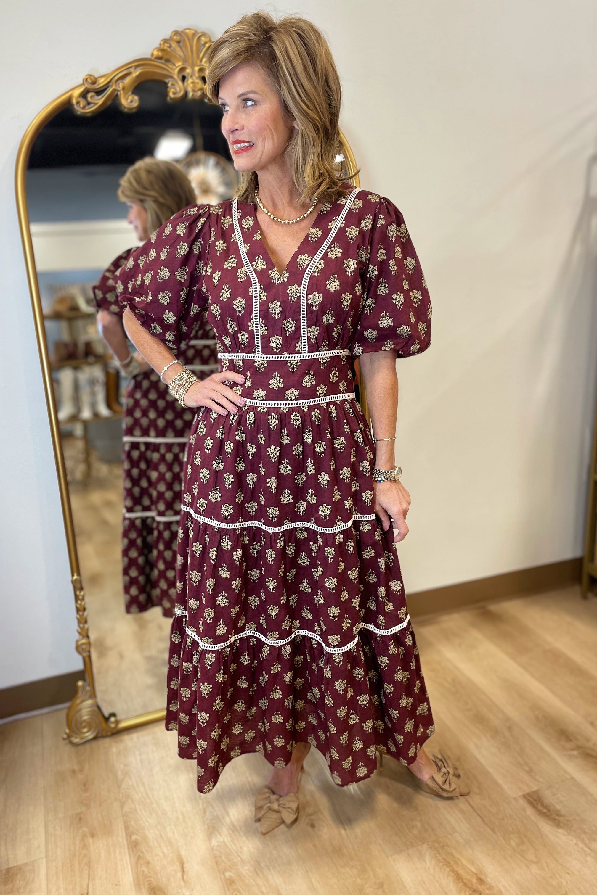 THML Tiered Print Midi Dress w Trim Accents Maroon