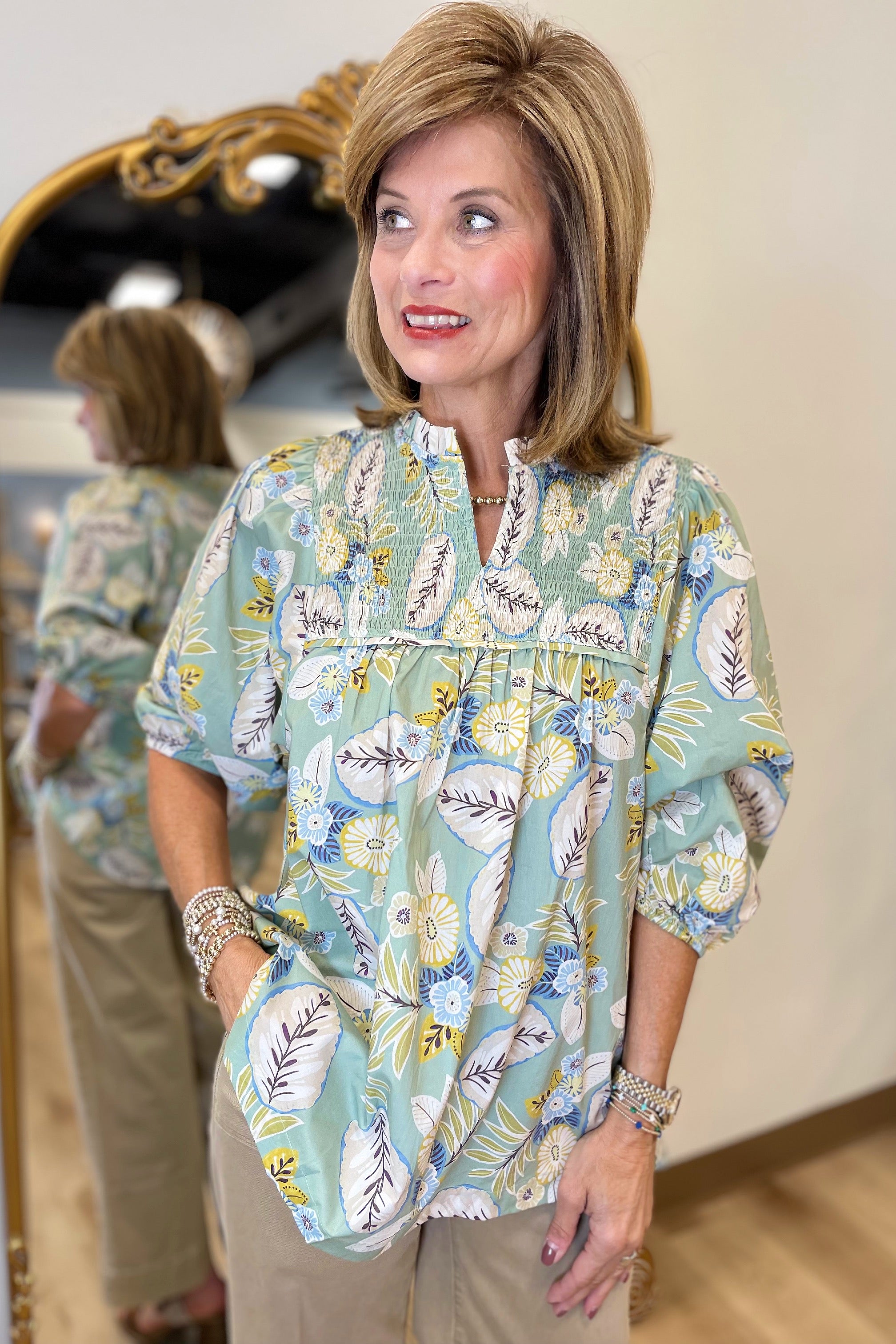 Umgee No Lining Abstract Print Smocking Detail Blouse Sage