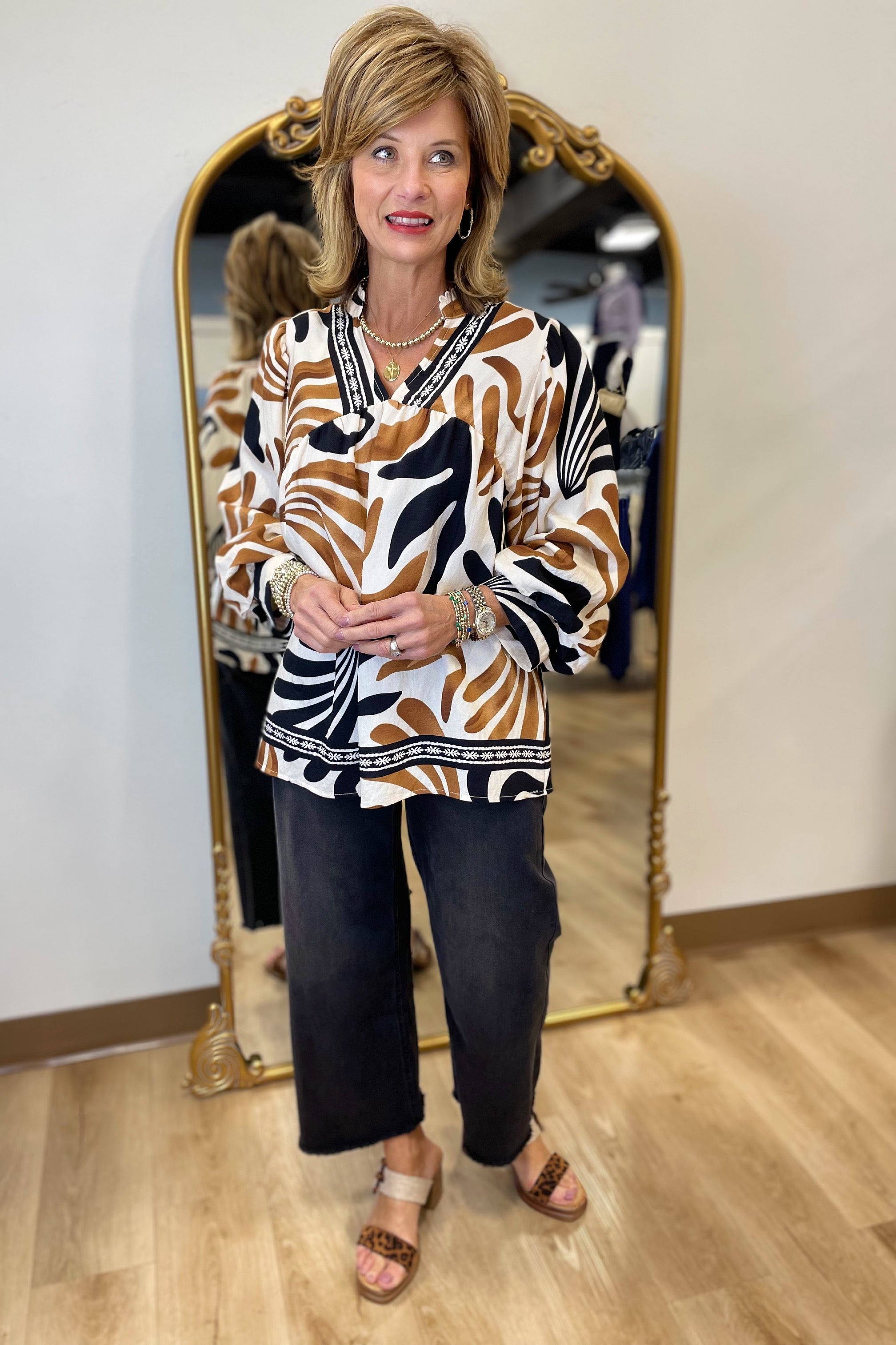 Umgee Boho Swirl 3/4 Sleeve Blouse w Lace Trim Brown Mix.