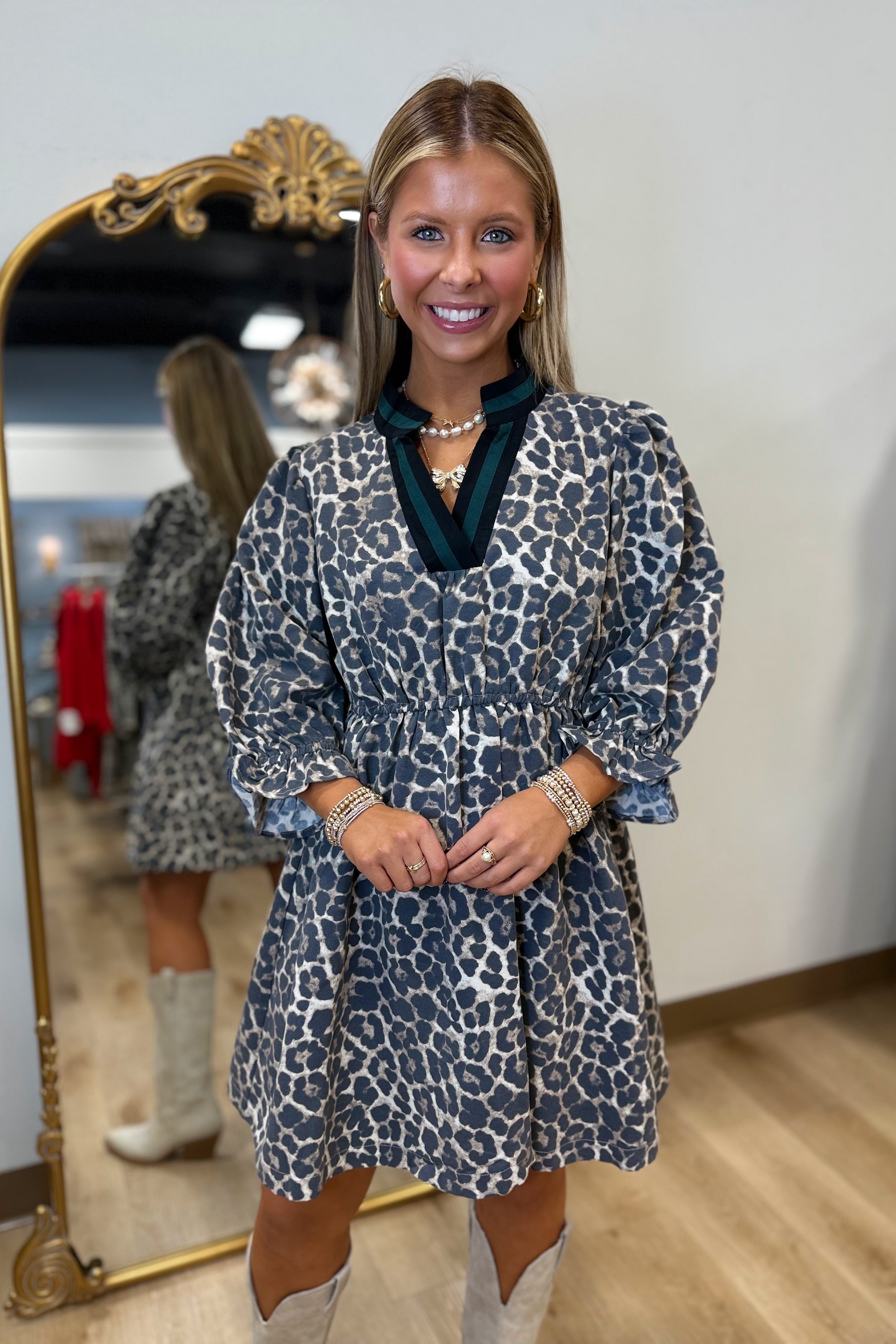 Leopard Print Puff Sleeve • Mini dress • V-notch • Trim detail • Elasticized waist - Cream