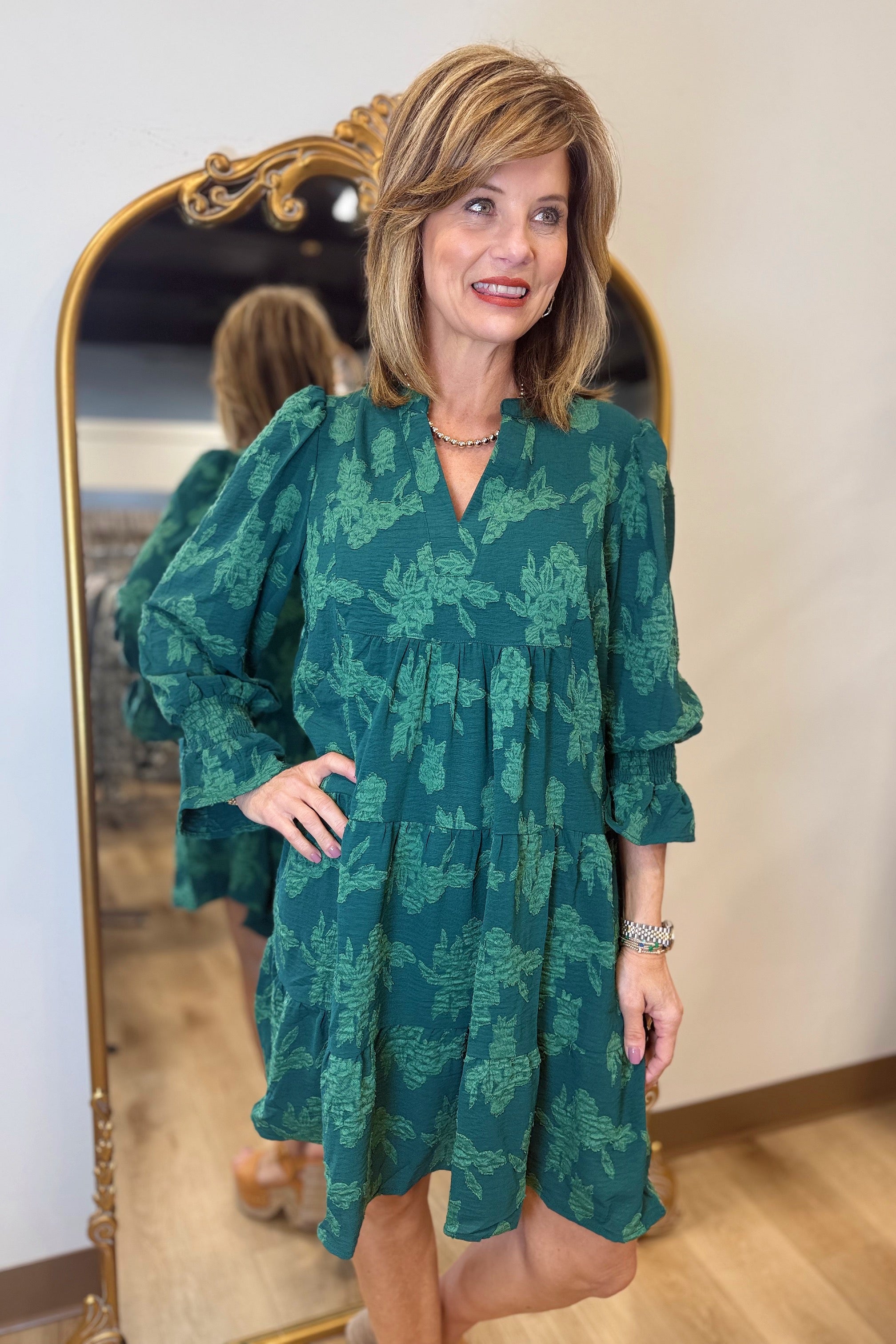 Umgee Tiered Long Sleeve Embossed Floral Dress Hunter Green