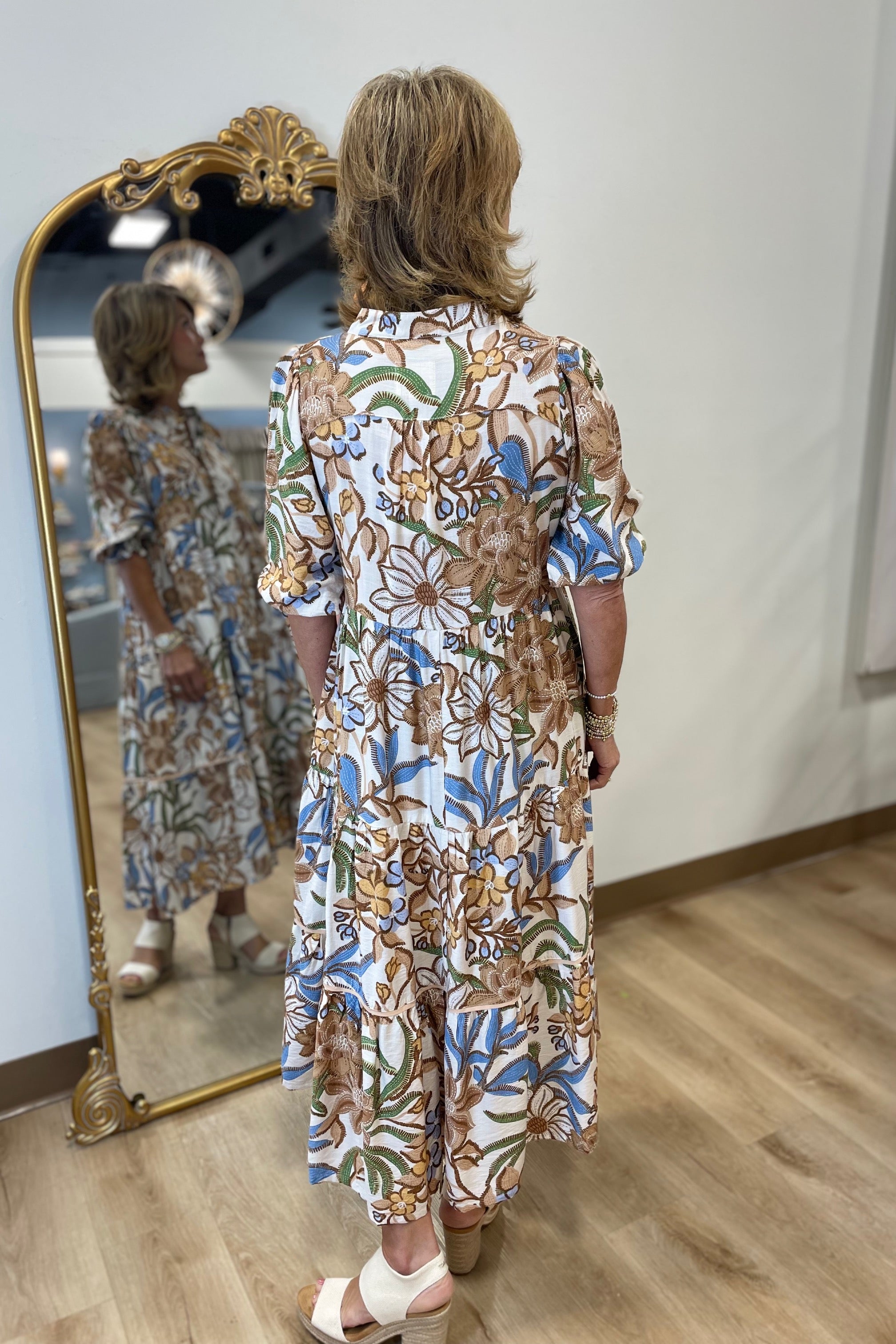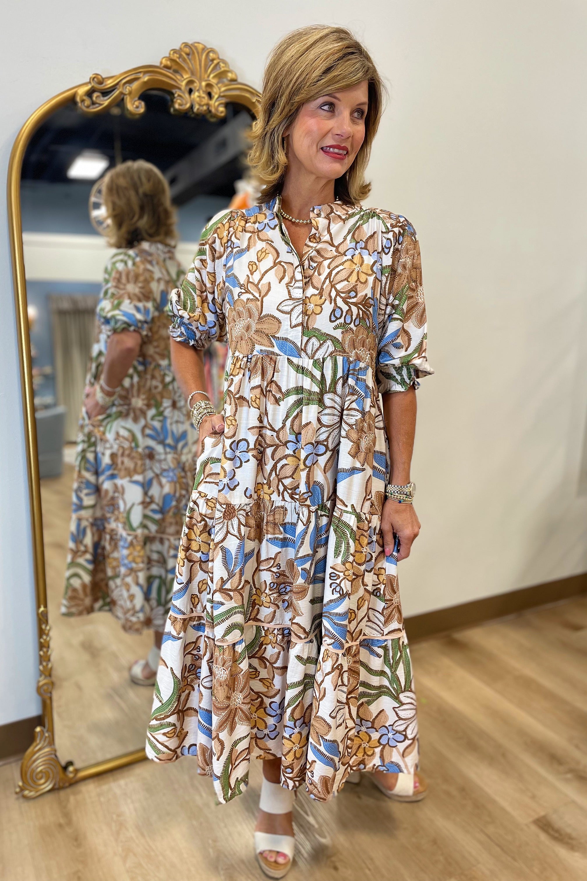 Umgee Floral Mix 3/4 Sleeve Print Dress Latte