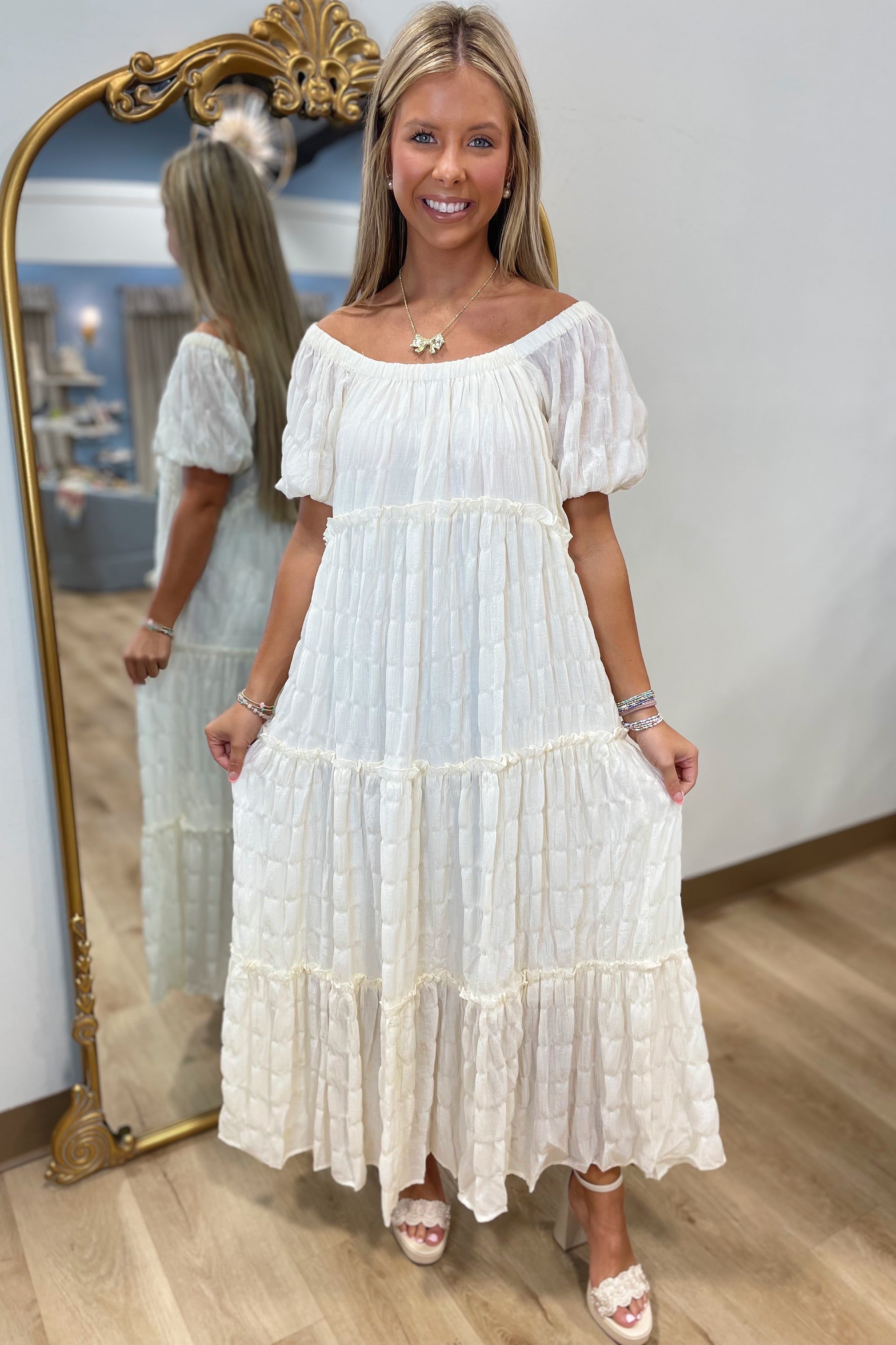 Umgee Flowing Textured Tiers Maxi Dress Cream Lined