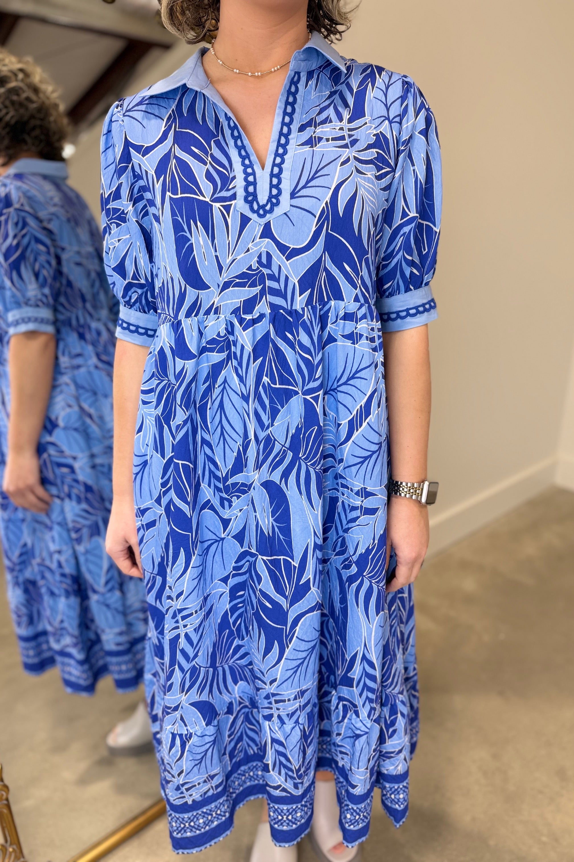 Umgee Leafy Border Midi Dress Blue