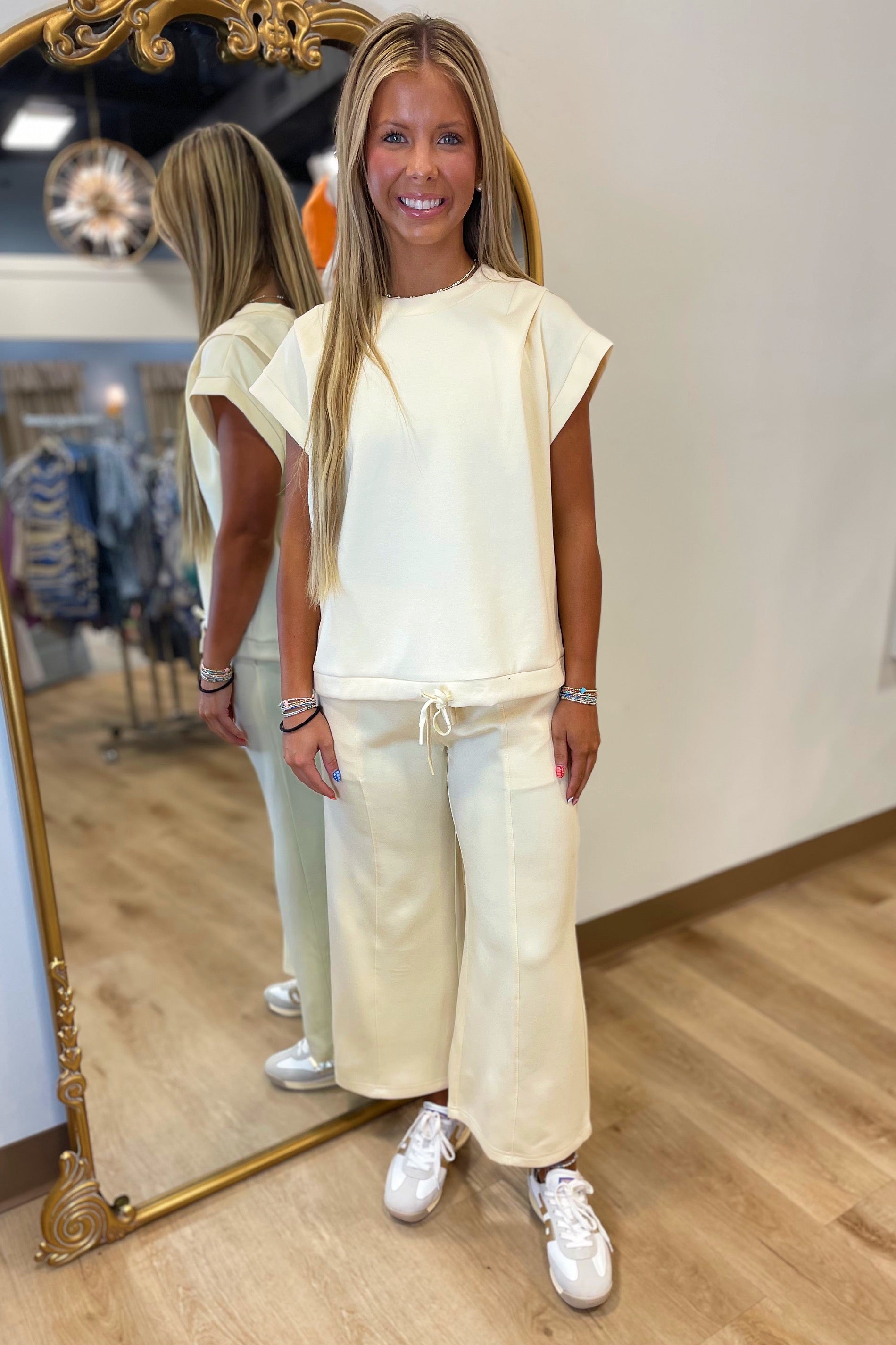 Umgee Luxeknit No Lining Capri Pant w Drawstring waist and front pockets Ecru