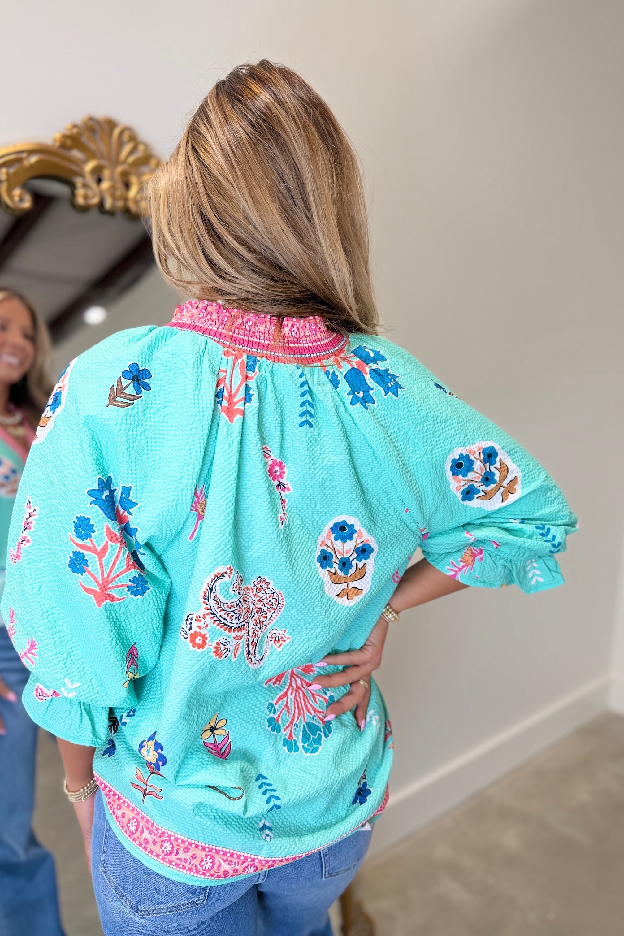 Umgee Mint Mix Print Short Sleeve Blouse w Contrast Trim.