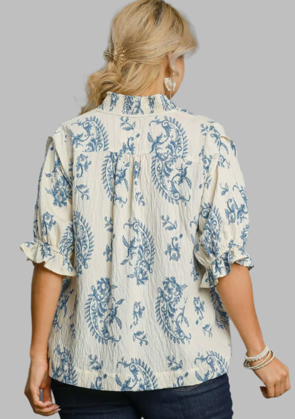 Umgee Plus Two Tone Paisley Print V Neck Top w Smocking Detail Blue