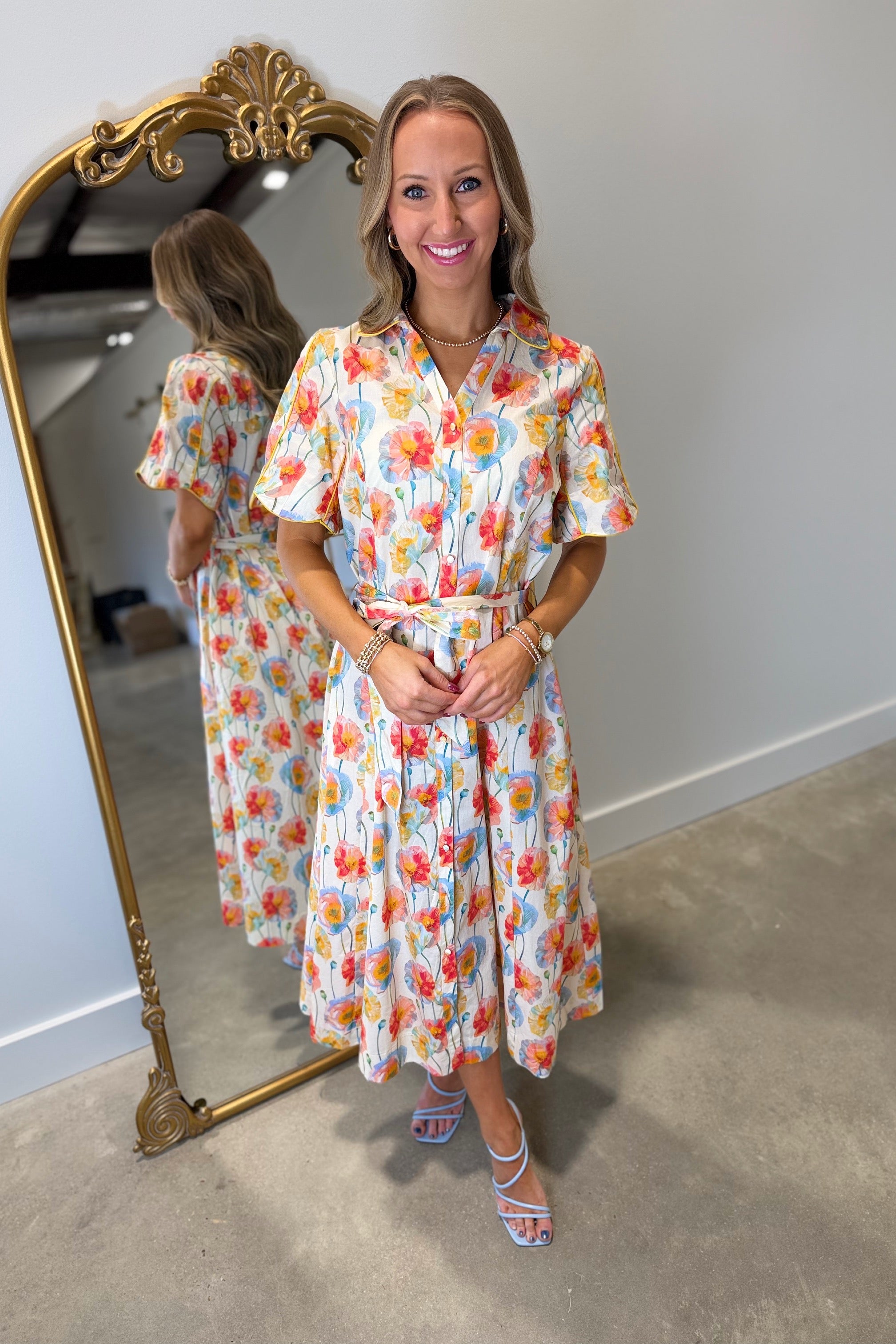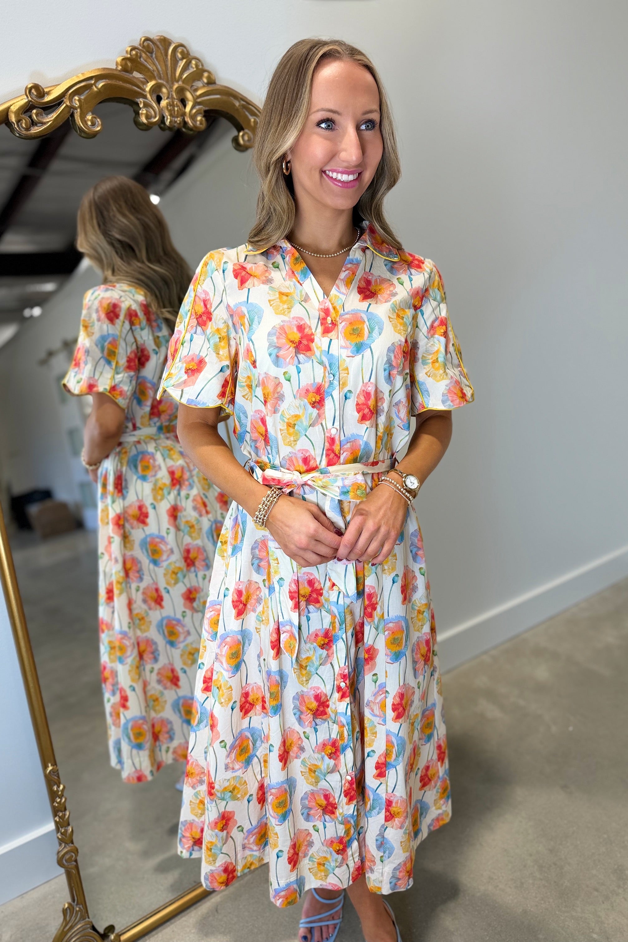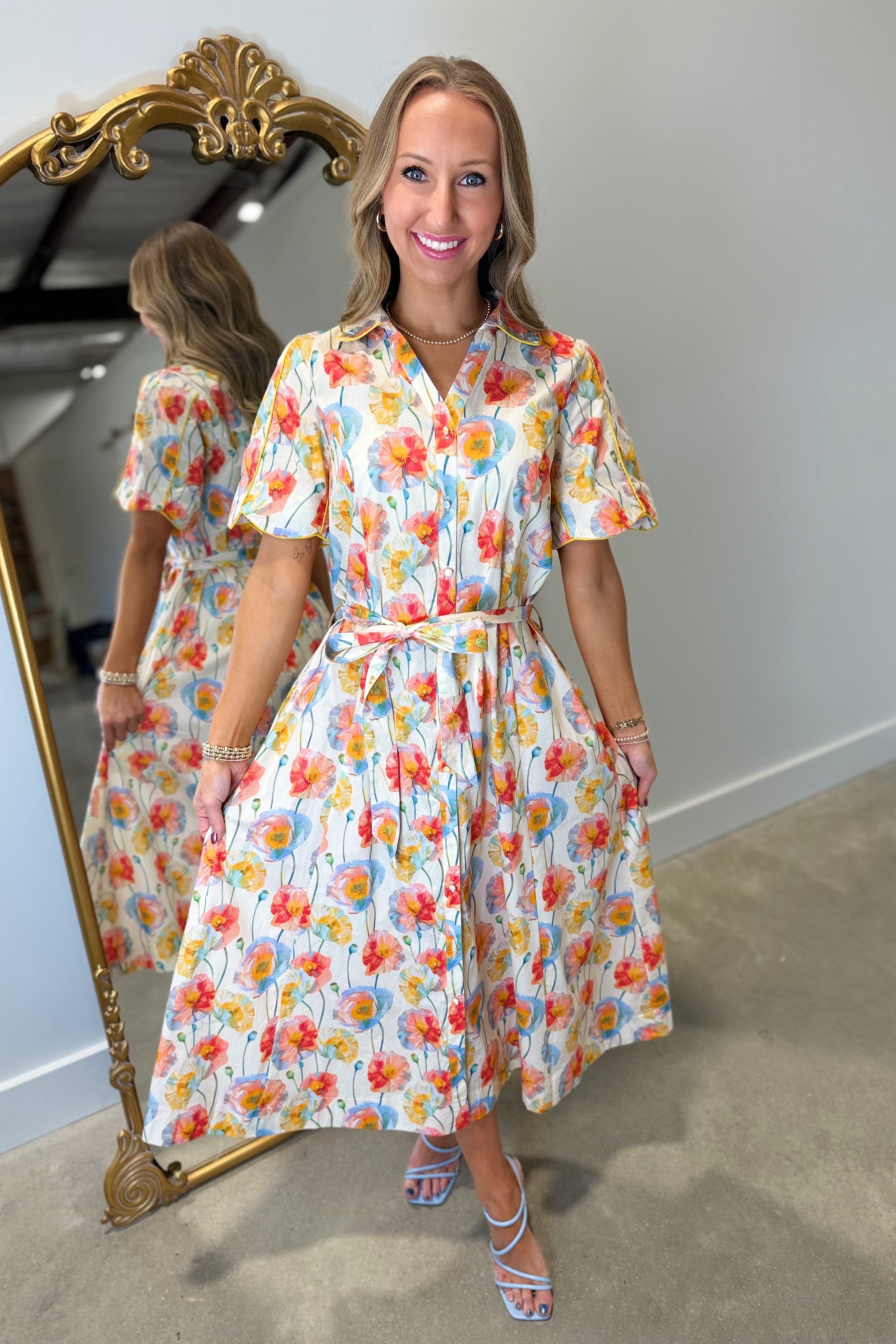 Umgee Shoreline Floral Short Sleeve Collared Button Front Midi Dress w Tie Belt Cream