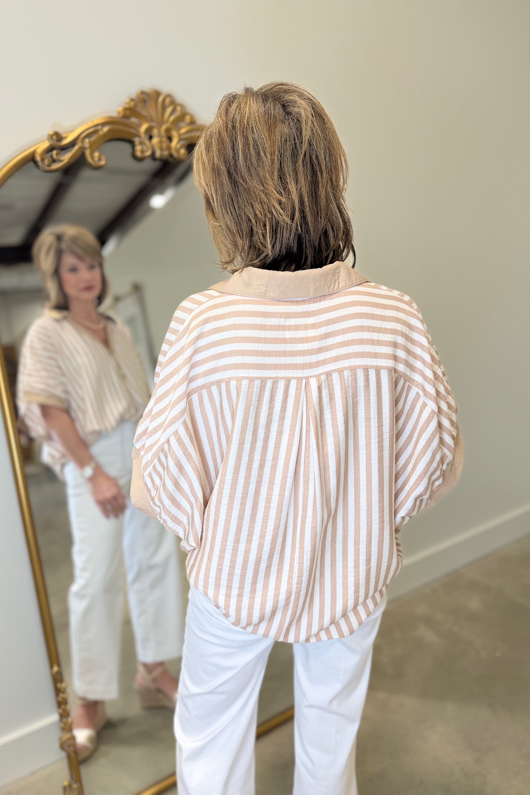 Umgee Split Neck w Buttons Short Sleeve Blouse Latte Stripe.