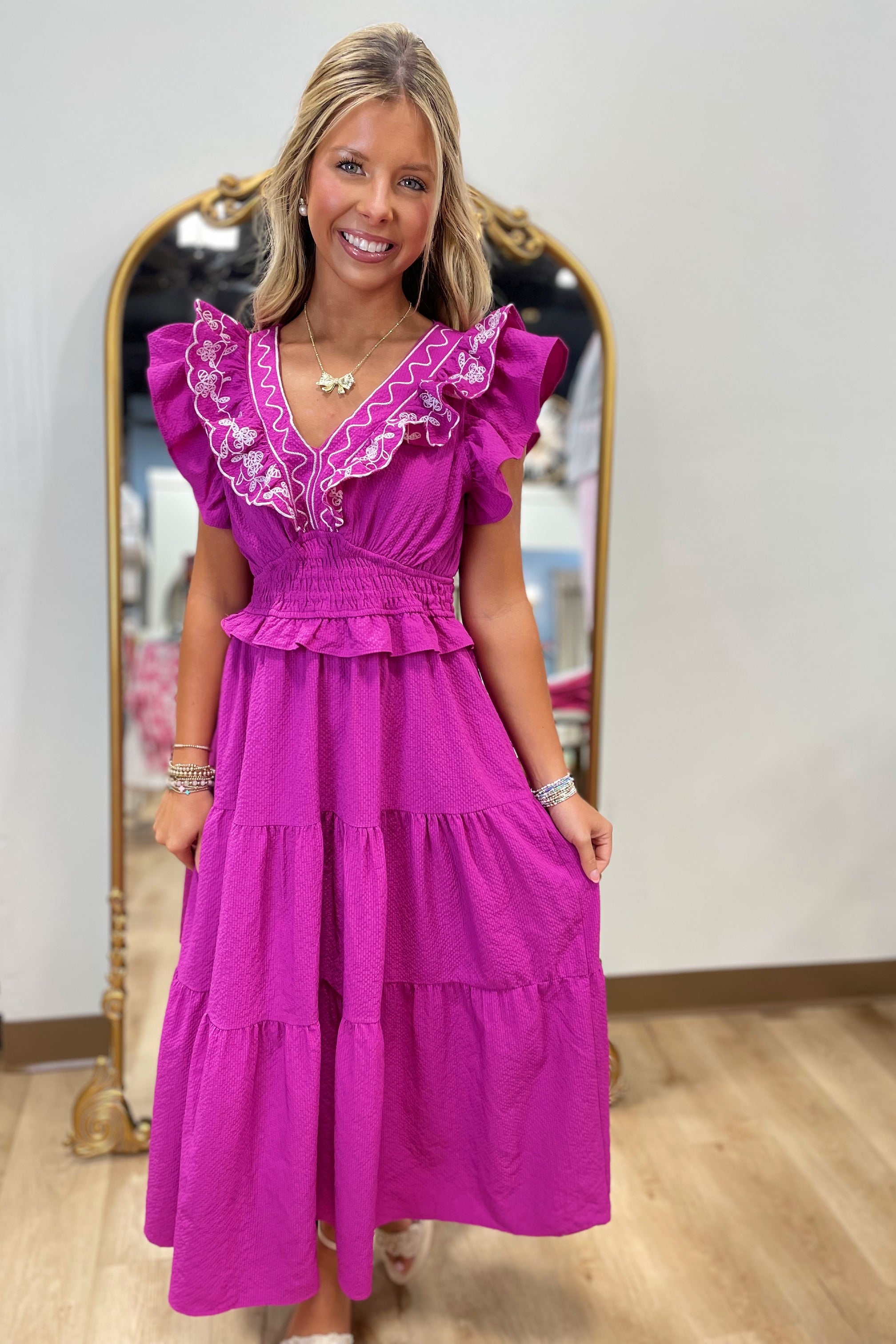 Umgee Sleeveless Stitch Detail Midi Dress w Tiers and Elastic Waist Magenta Lined