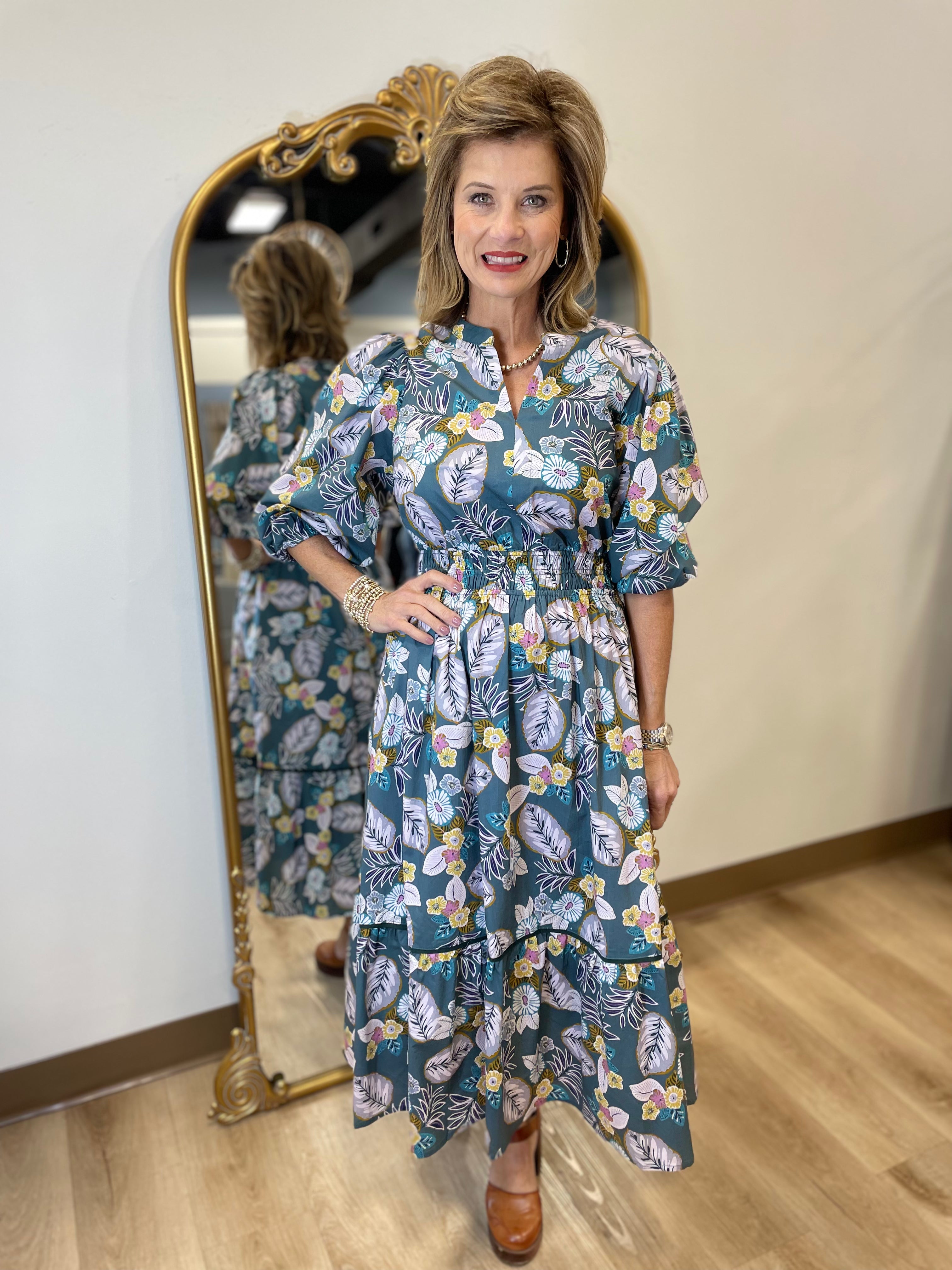 Umgee Teal Bouquet Smocked Waist Split Neck Dress