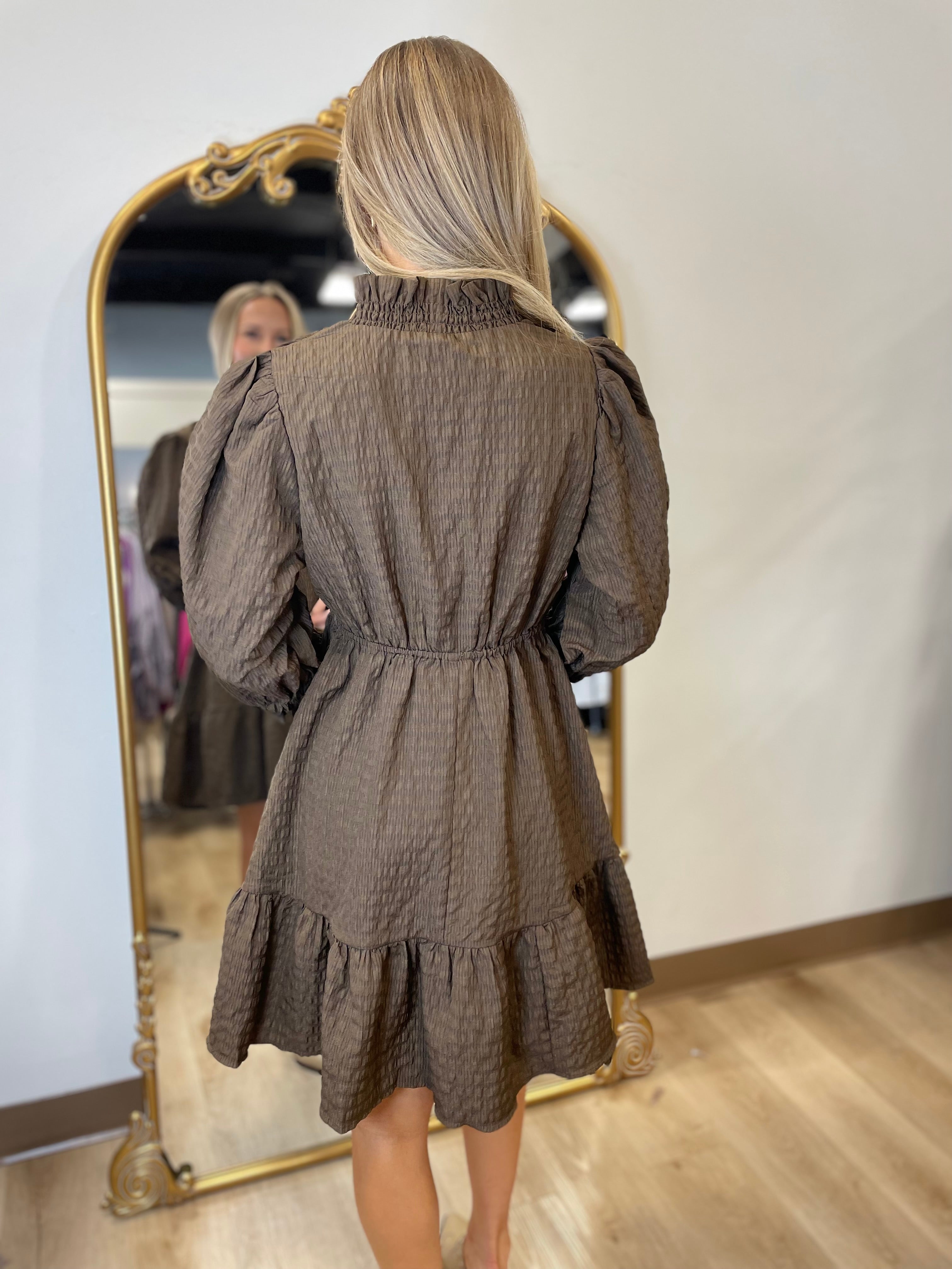 Umgee 1/2 Sleeve Textured Ruffle Accent Dress Brown
