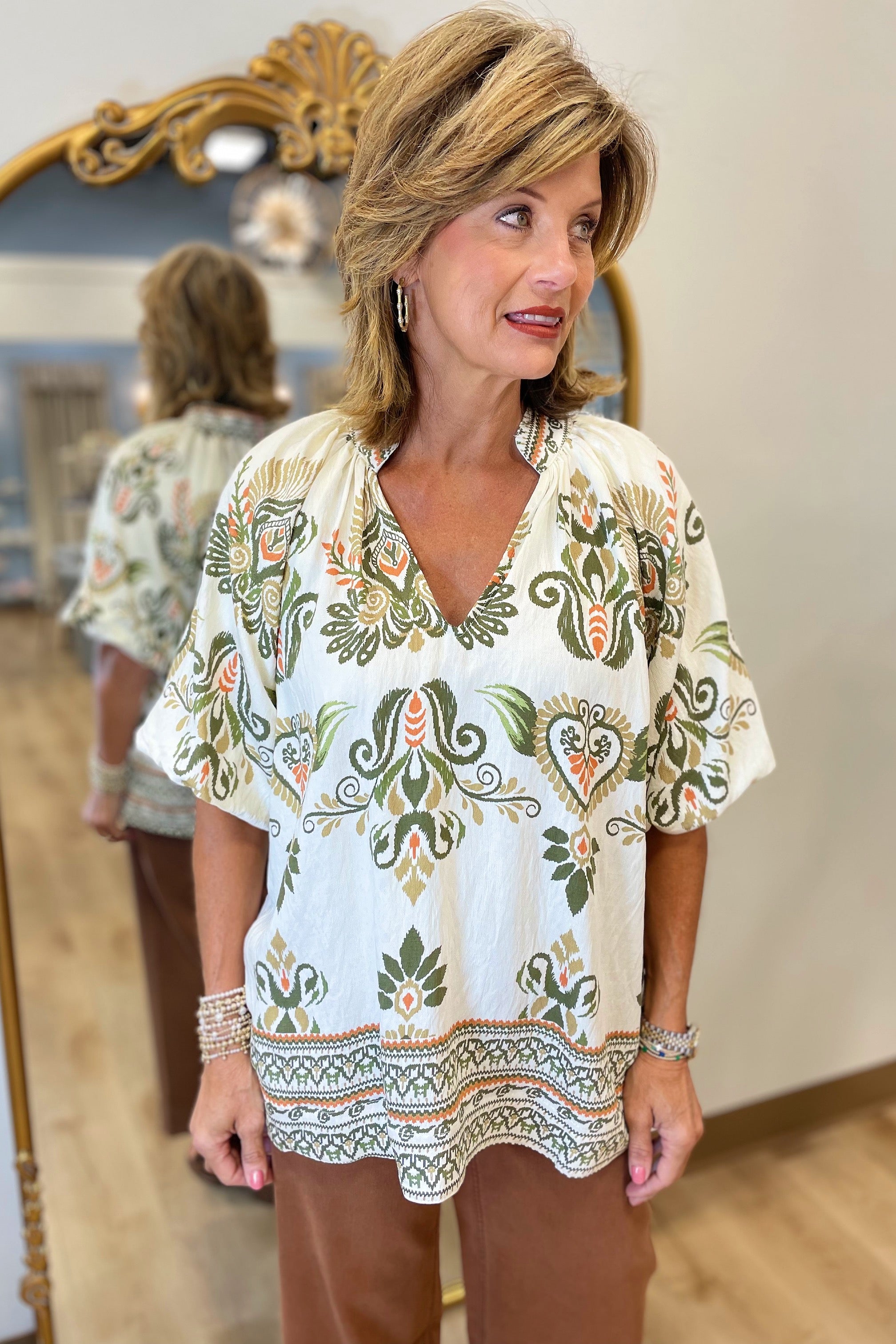 Umgee Two Tone V Slit Neck Top w Bubble Sleeves Olive