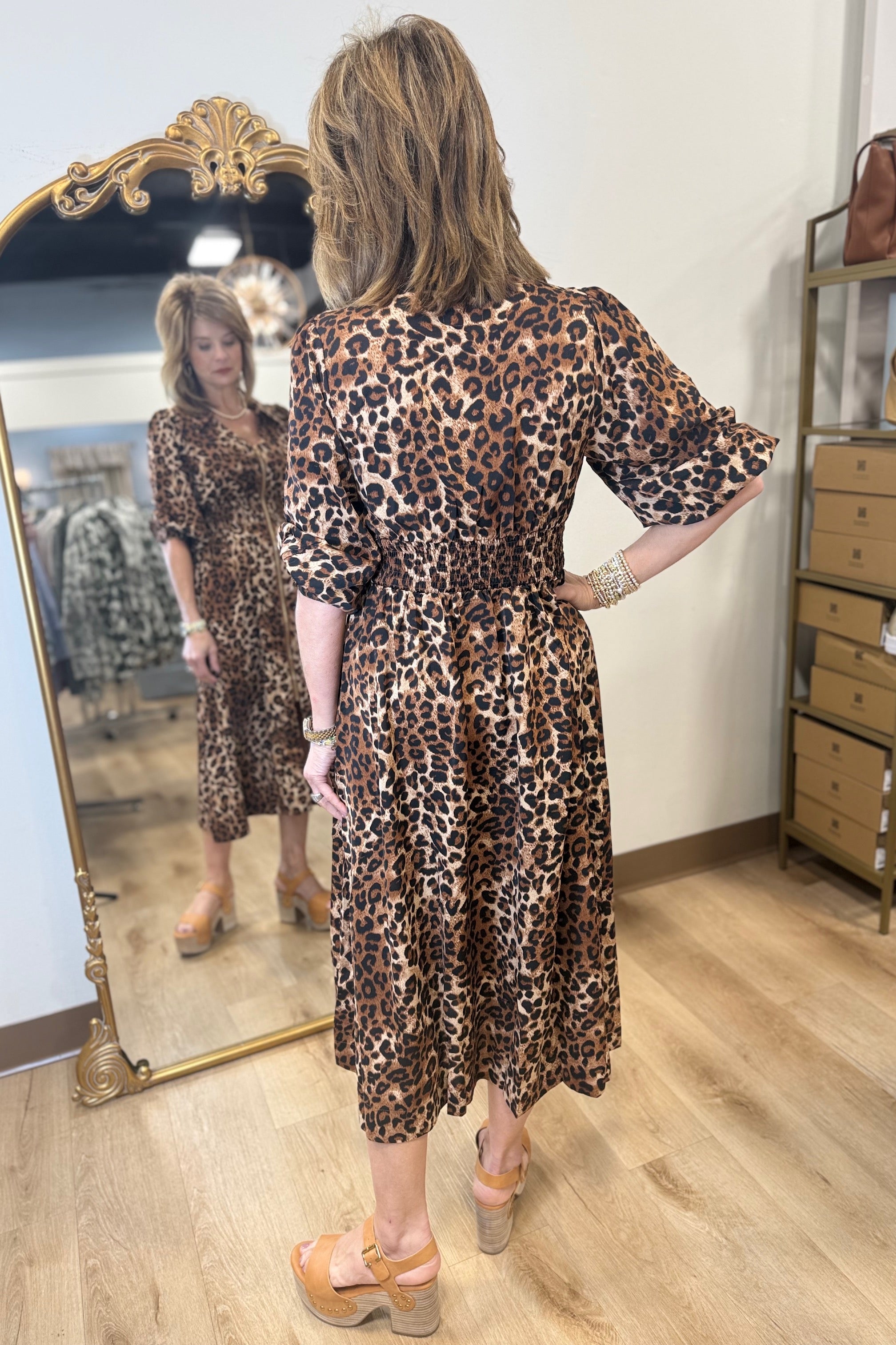 Umgee Leopard Print Zip Front Midi Dress w Smocked Waist