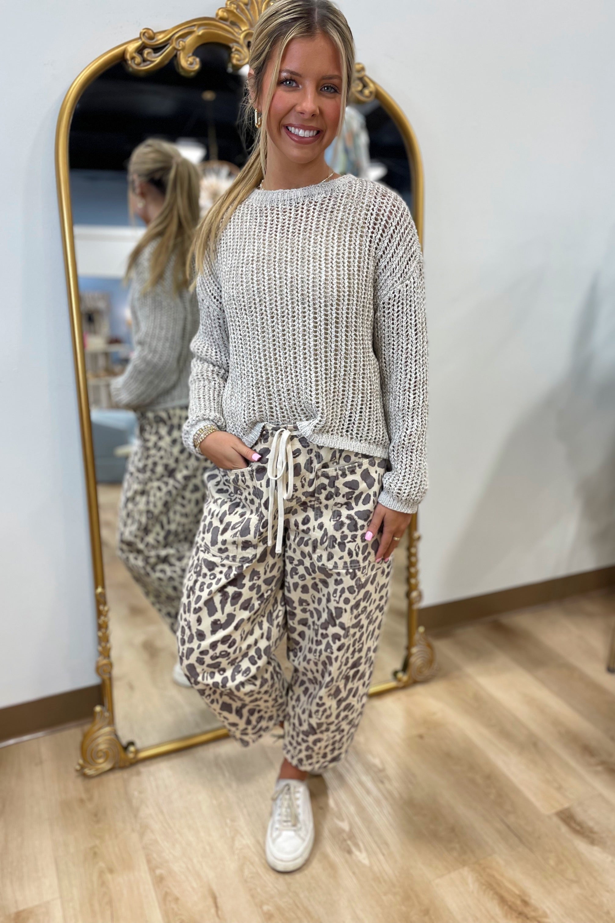 Abstract leopard pattern mid-rise ankle length pull-on balloon pants. Elastic back waistband with front adjustable drawstring tie. Front and back patch pockets. Unlined. Woven. Non-sheer. Midweight.