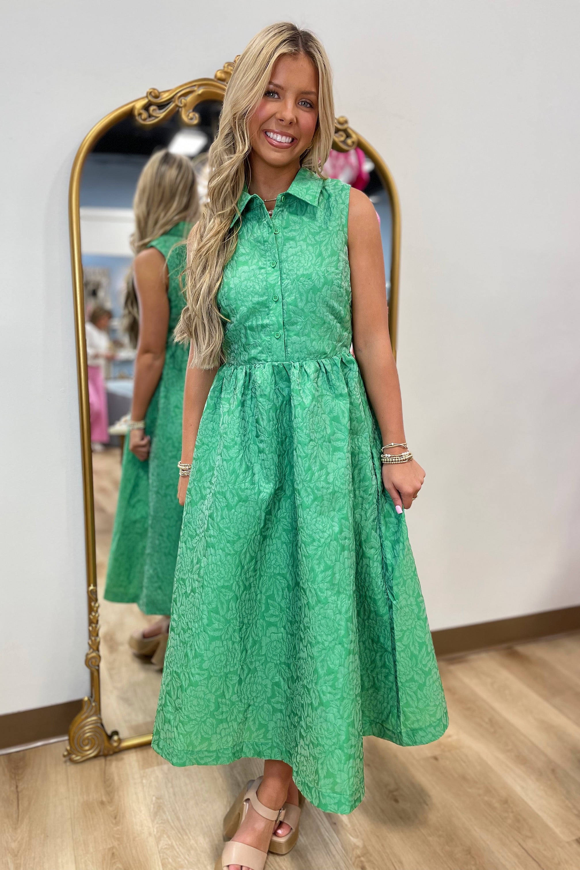 Vivid Jacquard Long Dress w Chic Collar Green Lined