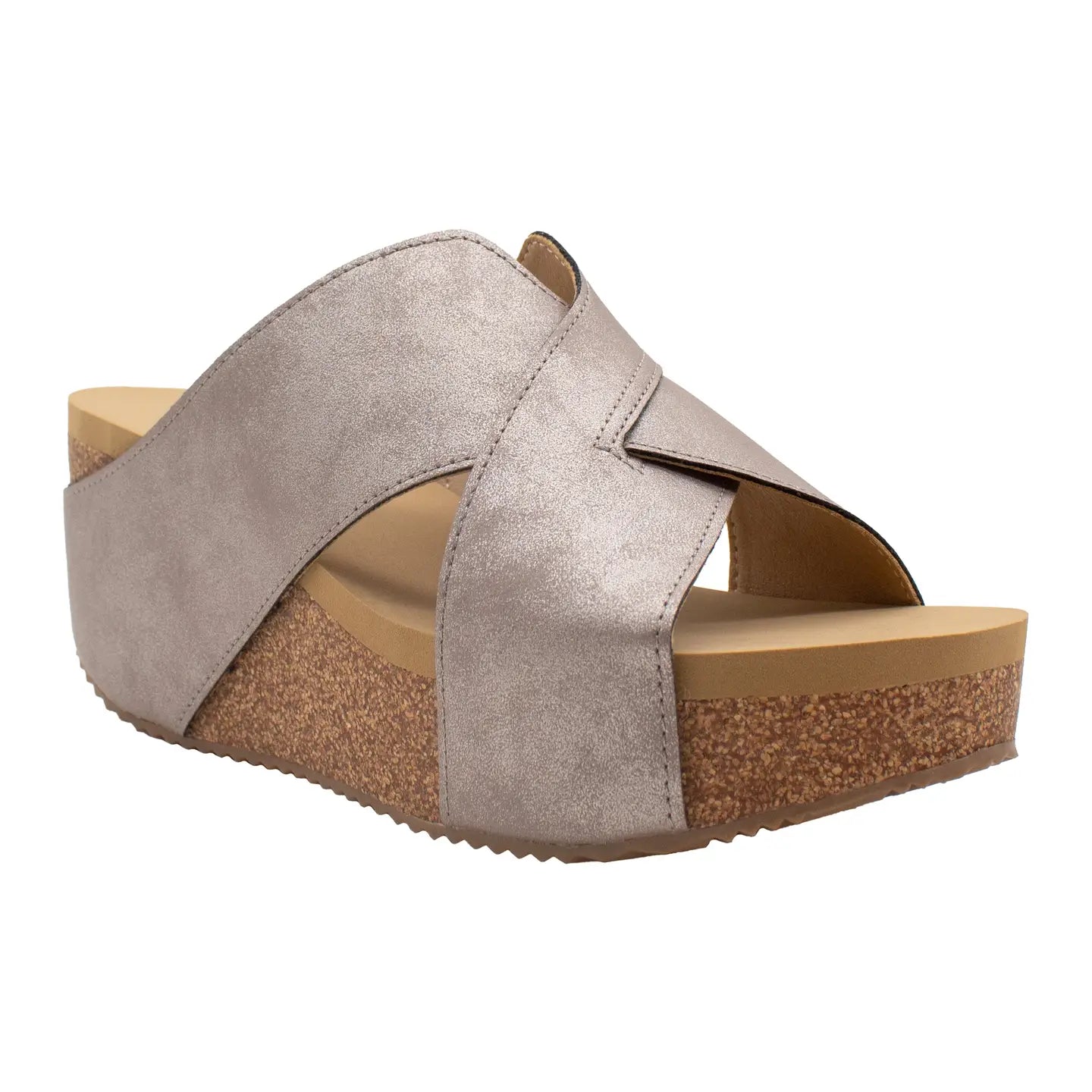 * Faux leather or metallic criss-cross slide * Synthetic lining * Signature ultra comfort EVA insole * Cork 2.75” wedge with rubber traction outsole Volatile's Firefly sandal will be a bright spot in your shoe collection. A 2.75" wedge paired with our signature ultra comfort EVA insole delivers all day comfort and style!